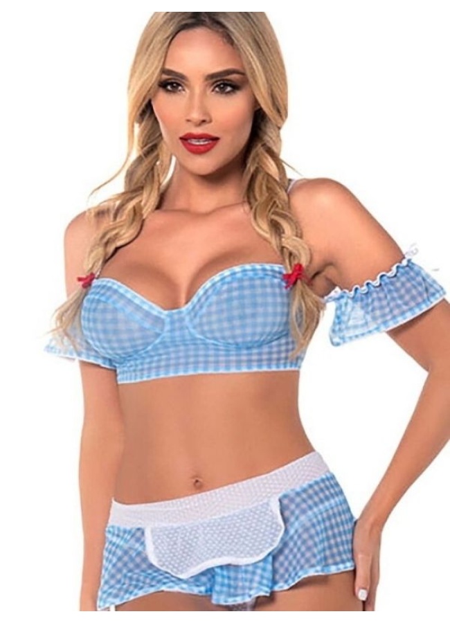 Büstiyer, etek ve stringden oluşmaktadır. Çorap paket içeriğine dahil değildir. Materyal : %100 Polyester
