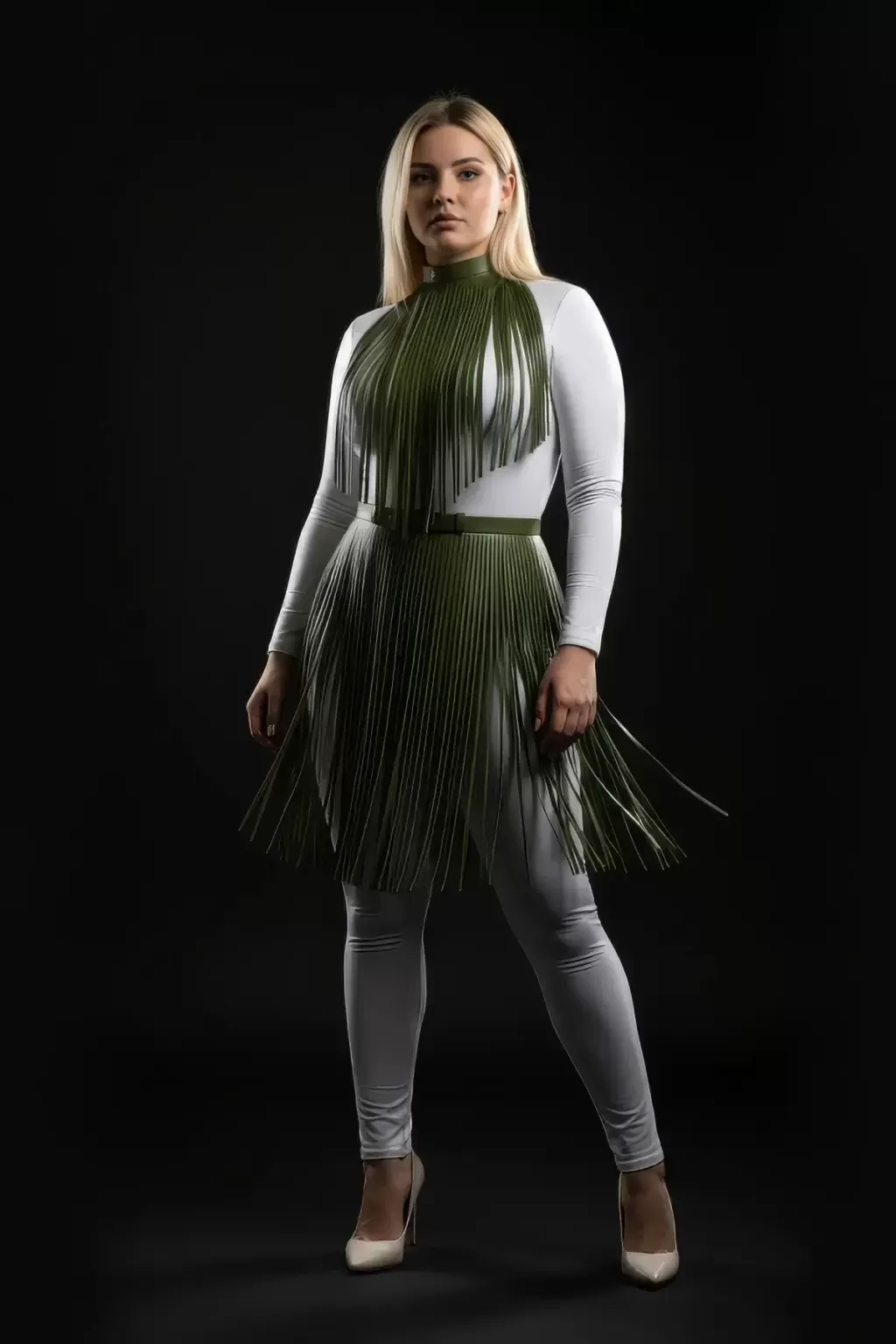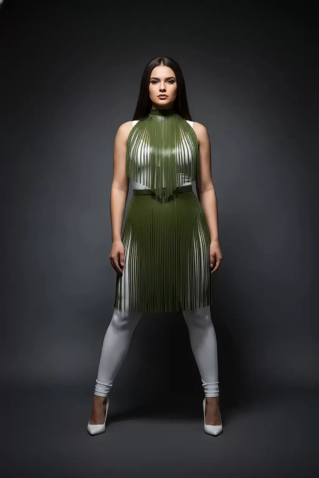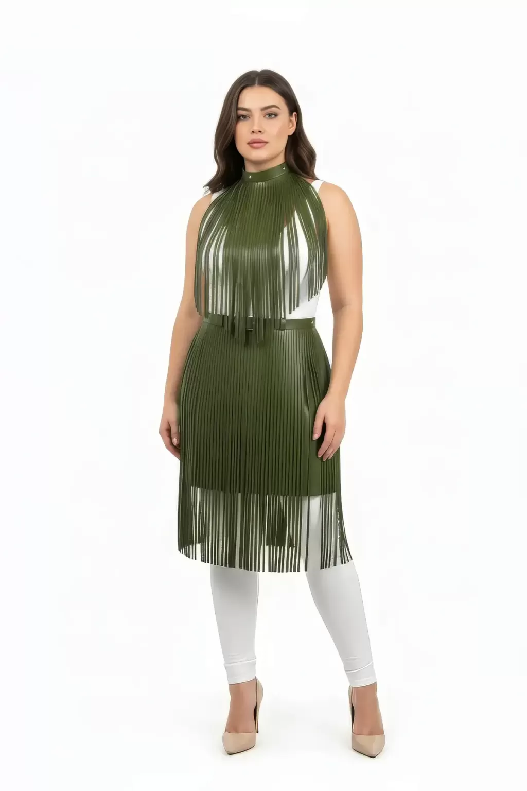 Büyük Beden Haki Deri Püskül Detaylı Uzun Etek - APFT997