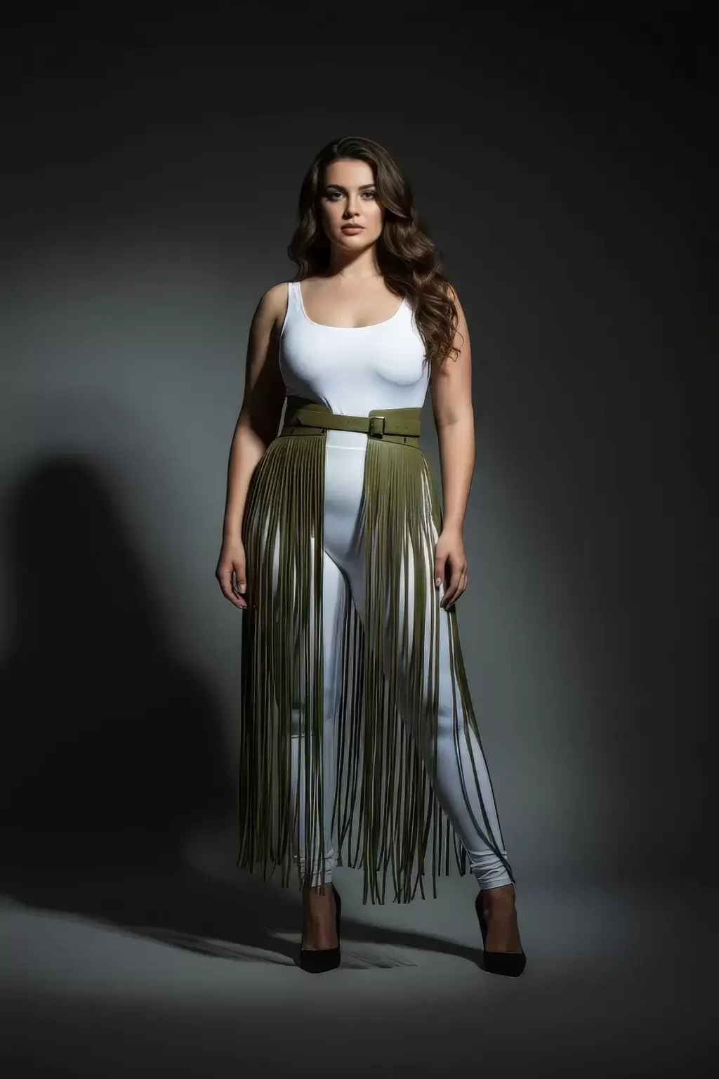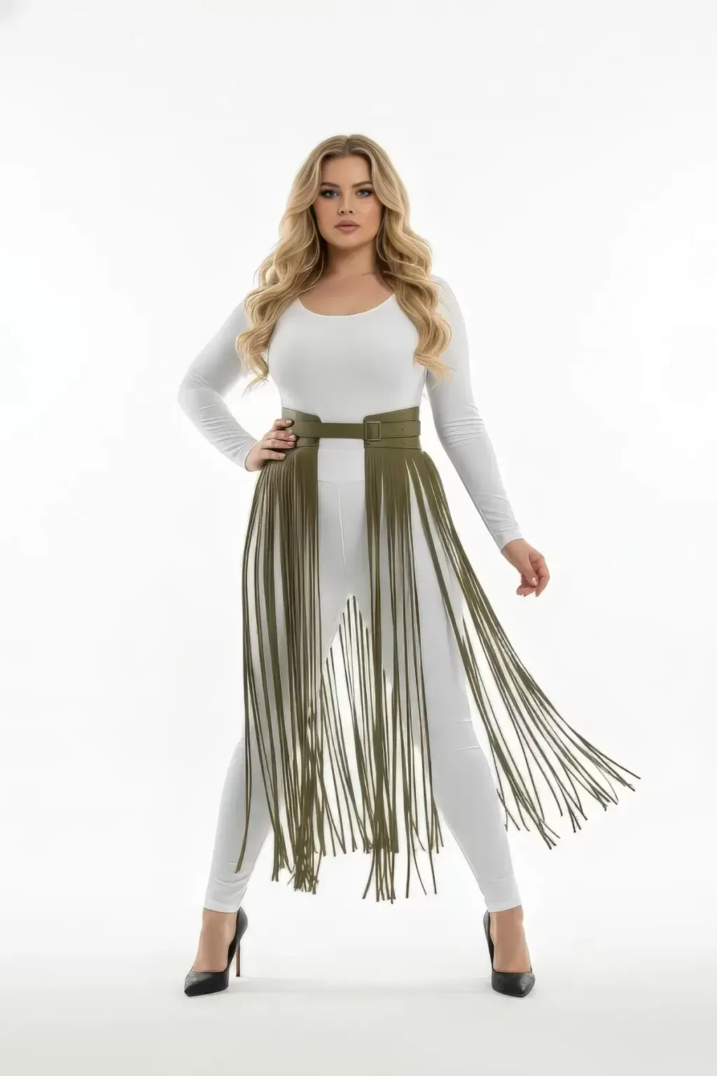 Büyük Beden Haki Deri Püskül Detaylı Yüksek Bel Etek - APFT1003