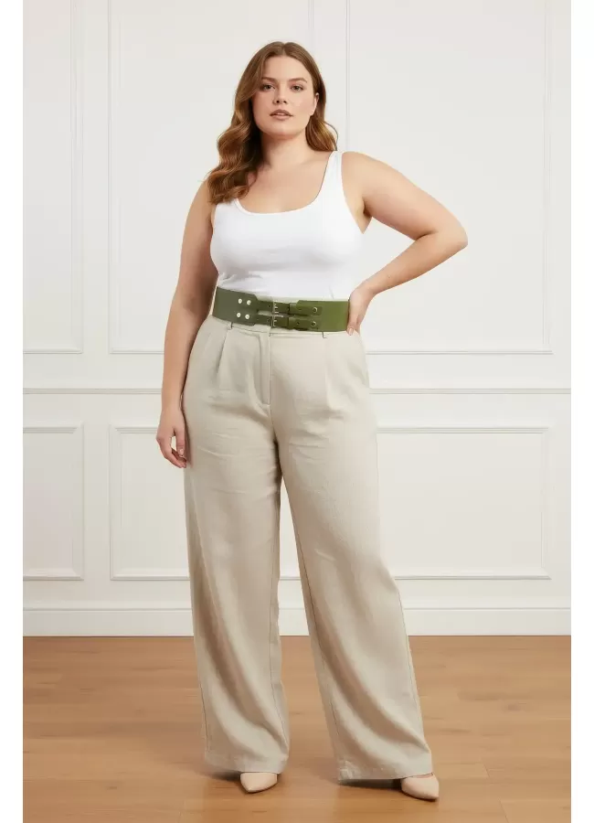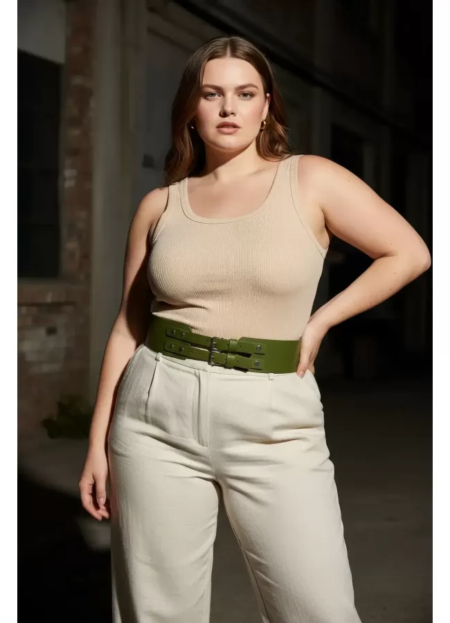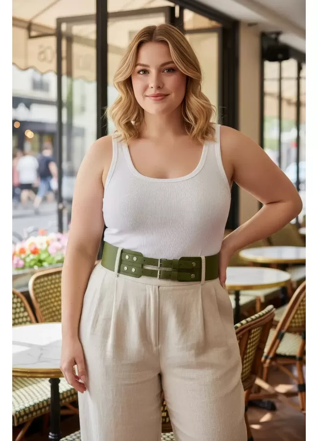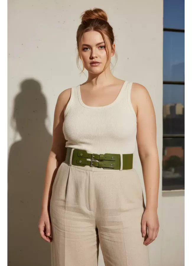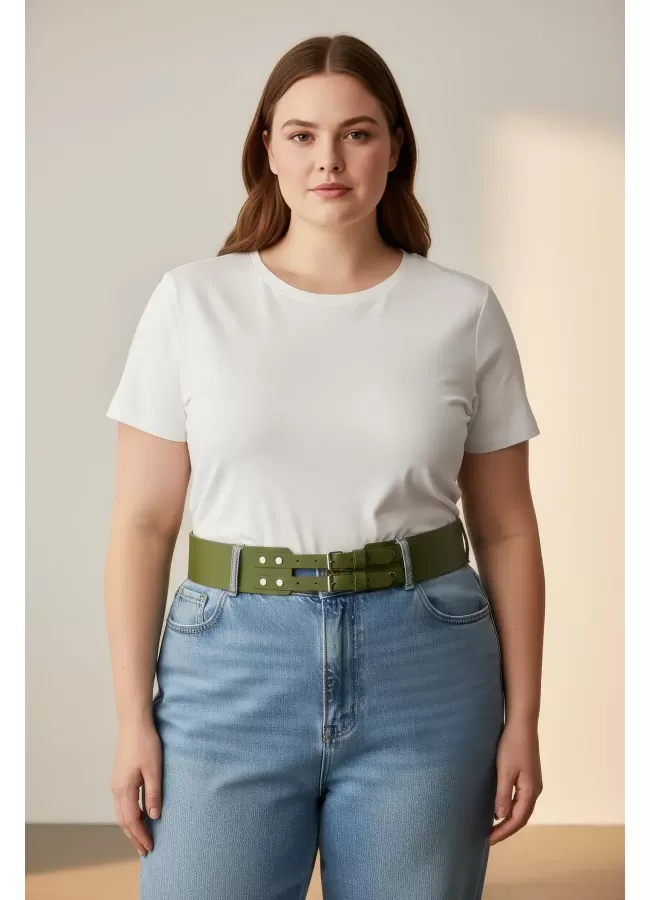 Büyük Beden Haki Kadın Kemer, Geniş Formlu Çift Tokalı Kombin Tamamlayıcı - APFT1203