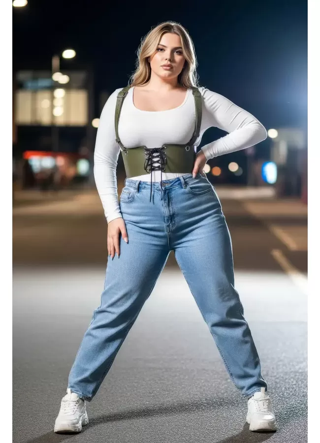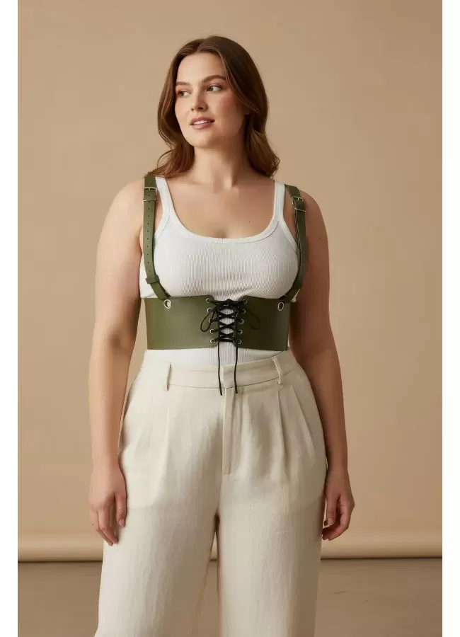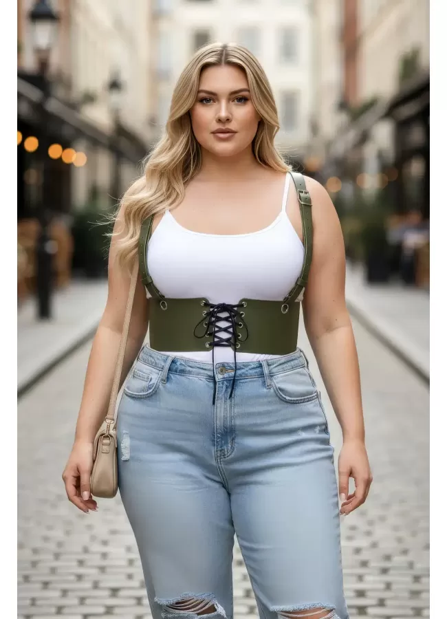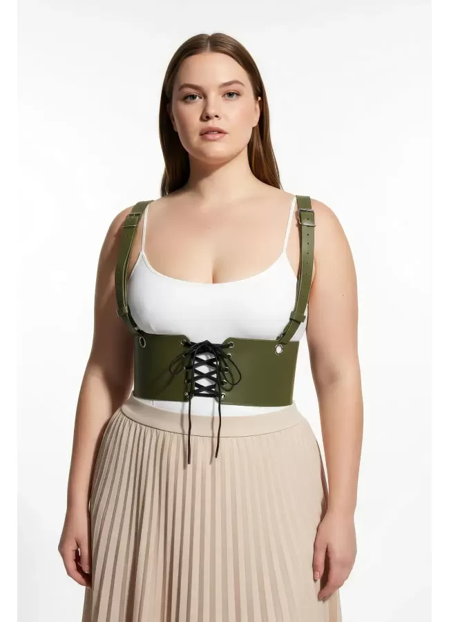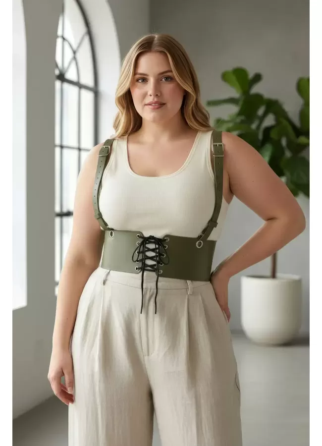 Büyük Beden Haki Kadın Kemer Omuz Askılı Bağlamalı Korse Stili - APFT1429