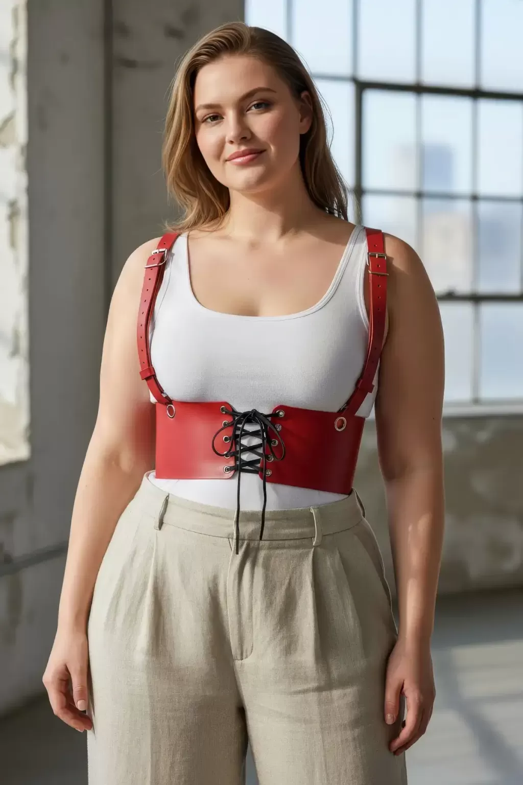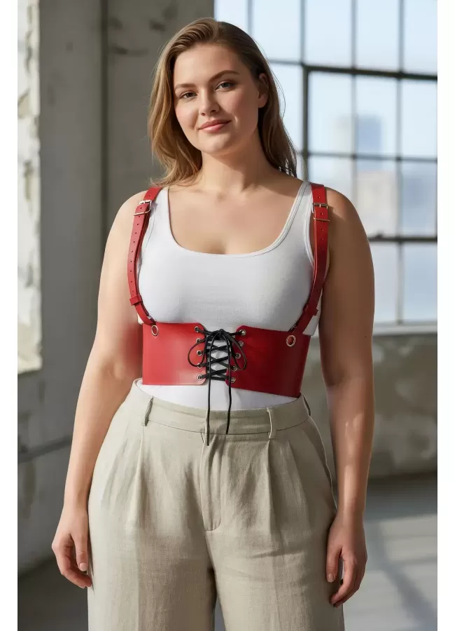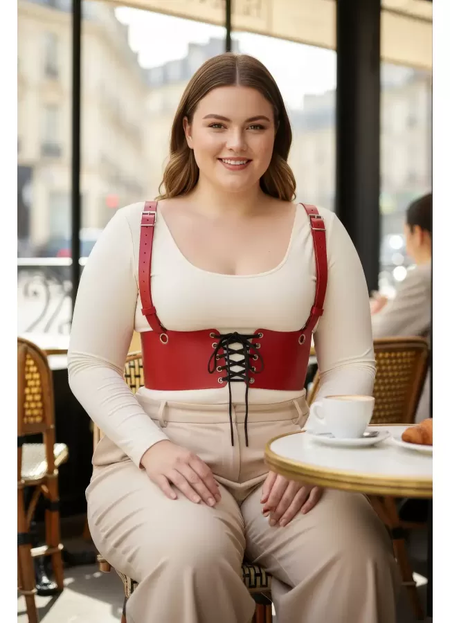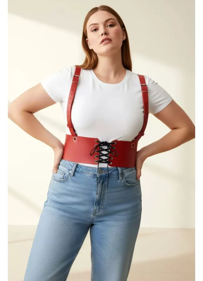 Büyük Beden Kırmızı Kadın Deri Askılı Korse Kemer Bağcıklı Model - APFT1429