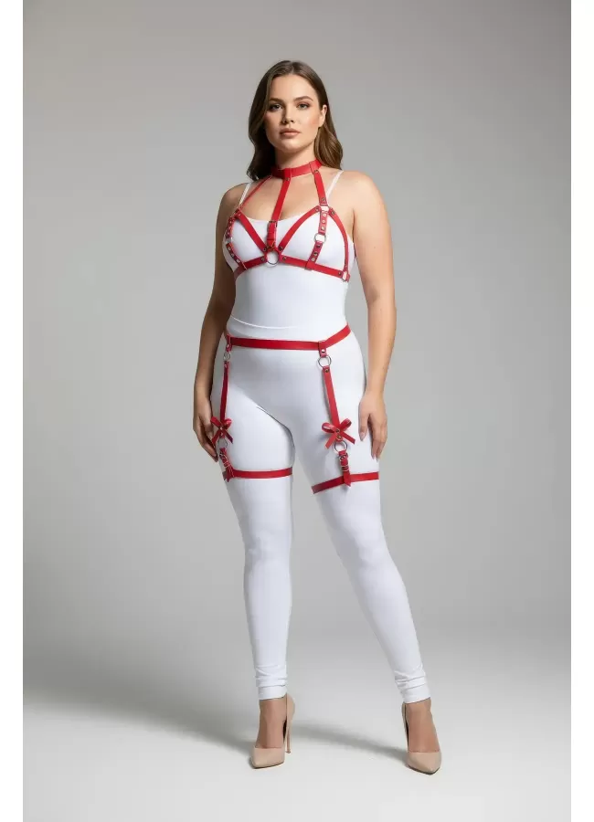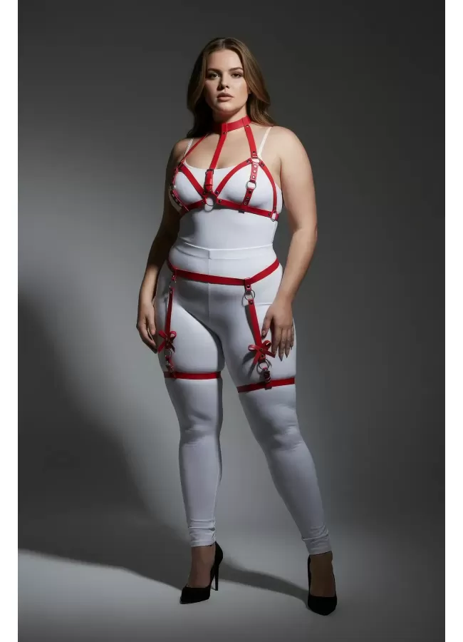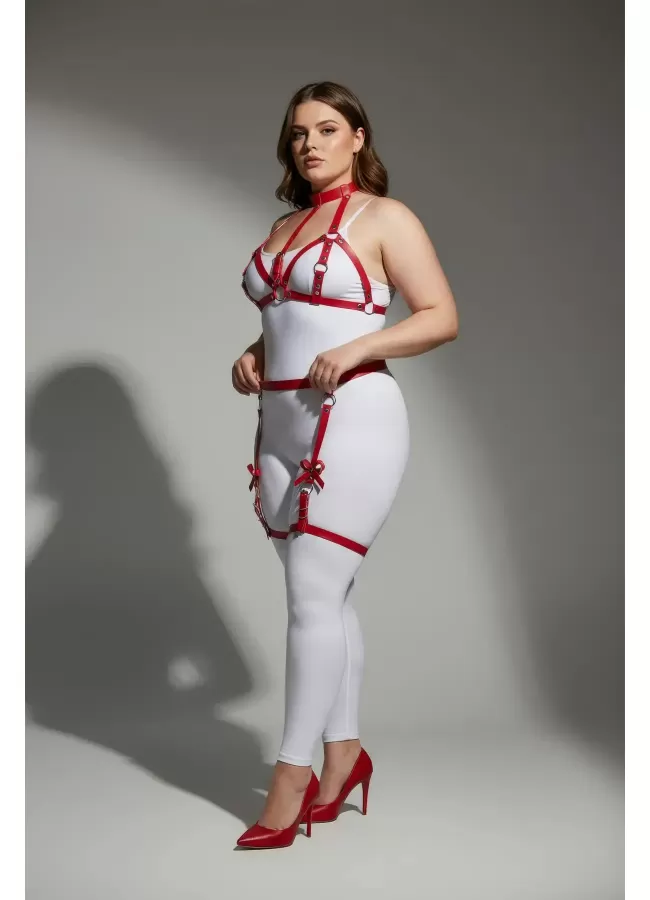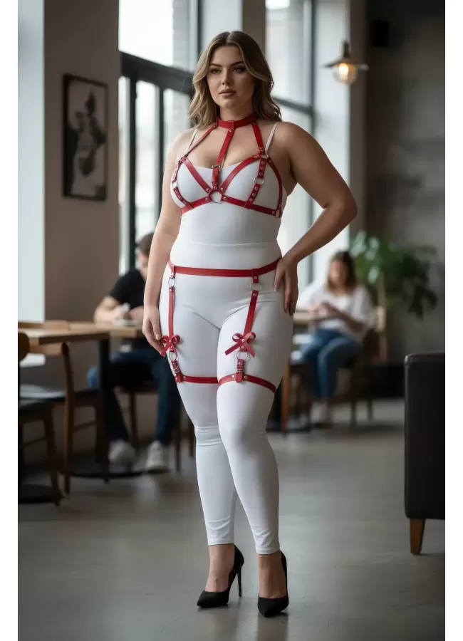 Büyük Beden Kırmızı Kadın Deri Görünümlü Fiyonk Detaylı Jartiyer Harness Takım - APFT310