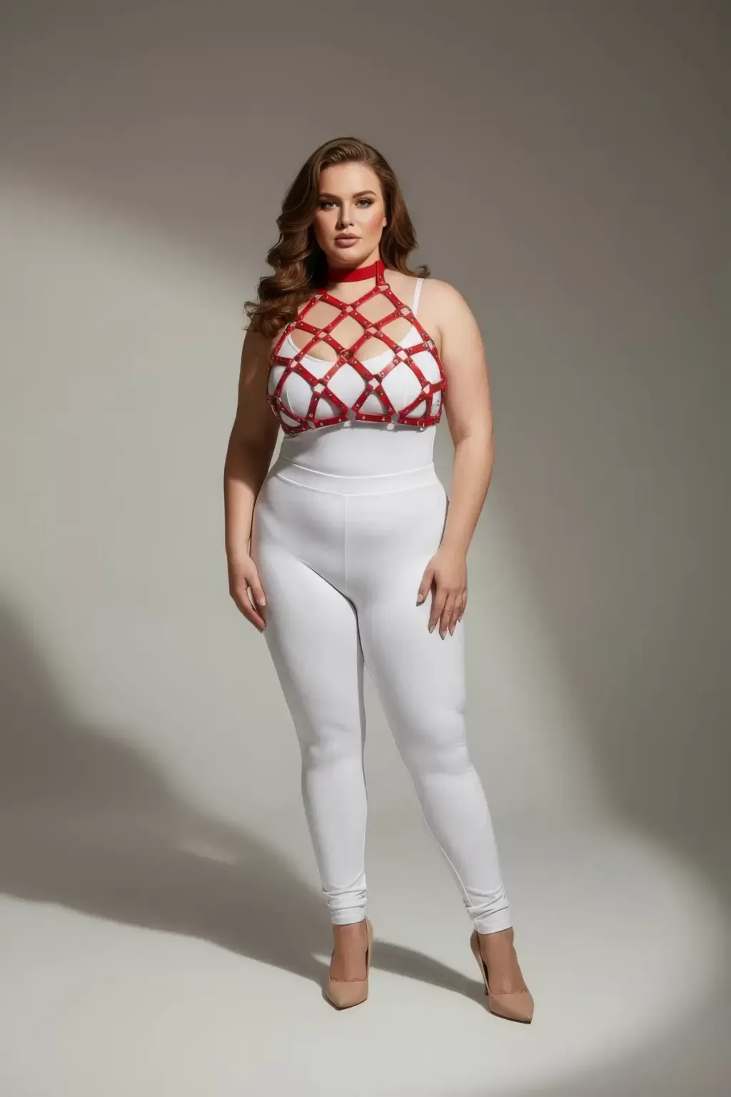Büyük Beden Kırmızı Kadın Deri Harness Takım Çivi Detaylı Şık Aksesuar - APFT443