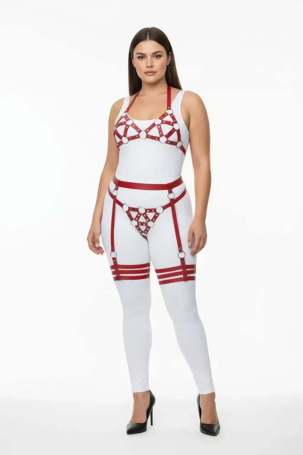 Büyük Beden Kırmızı Kadın Deri Harness Takım Halka Detaylı Jartiyerli Fantezi Aksesuar - APFT530