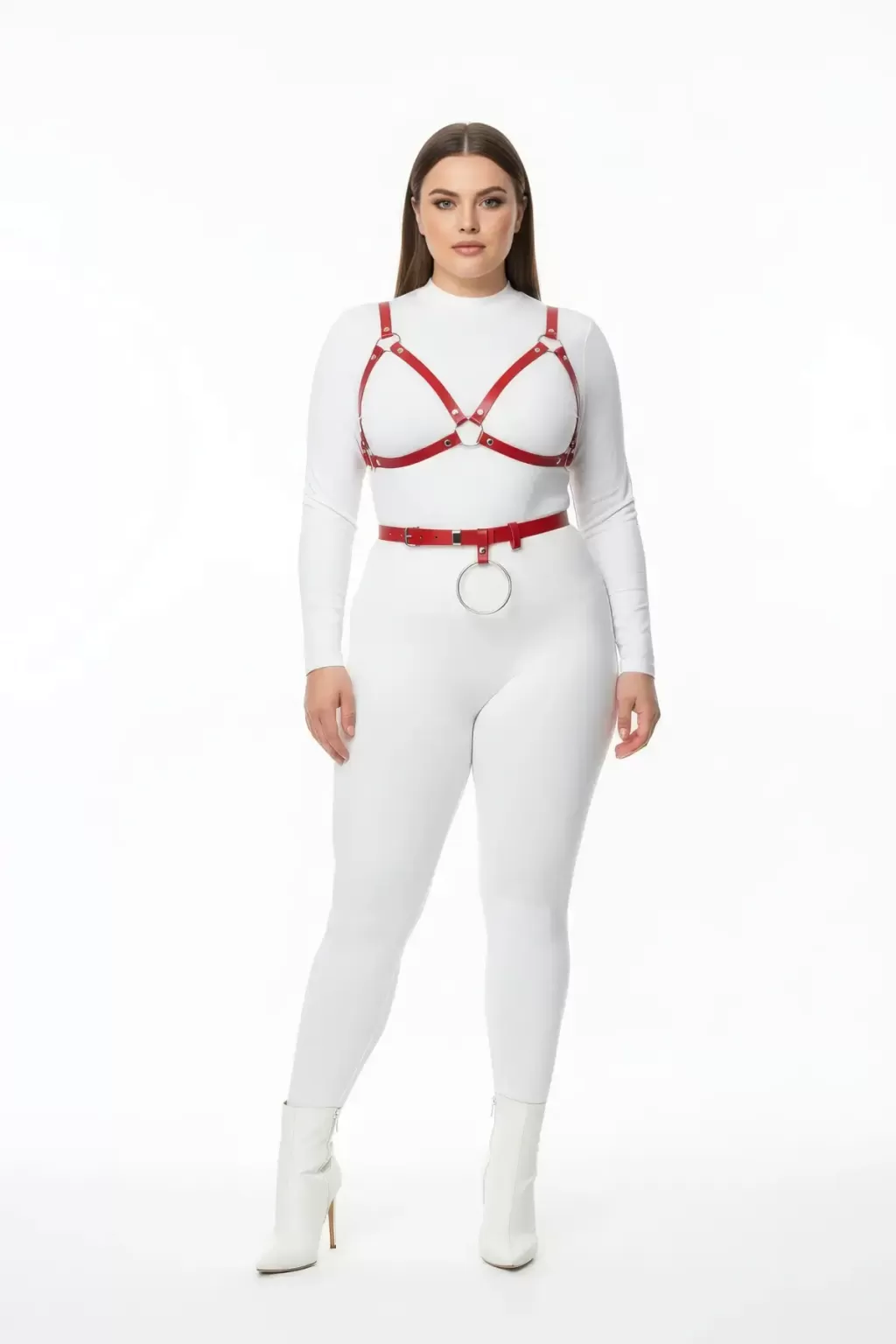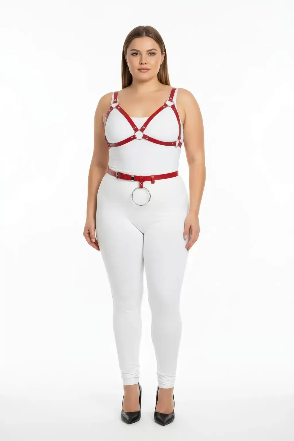 Büyük Beden Kırmızı Kadın Deri Harness Takım Halka Detaylı Sütyen Kemer Kombin - APFT651