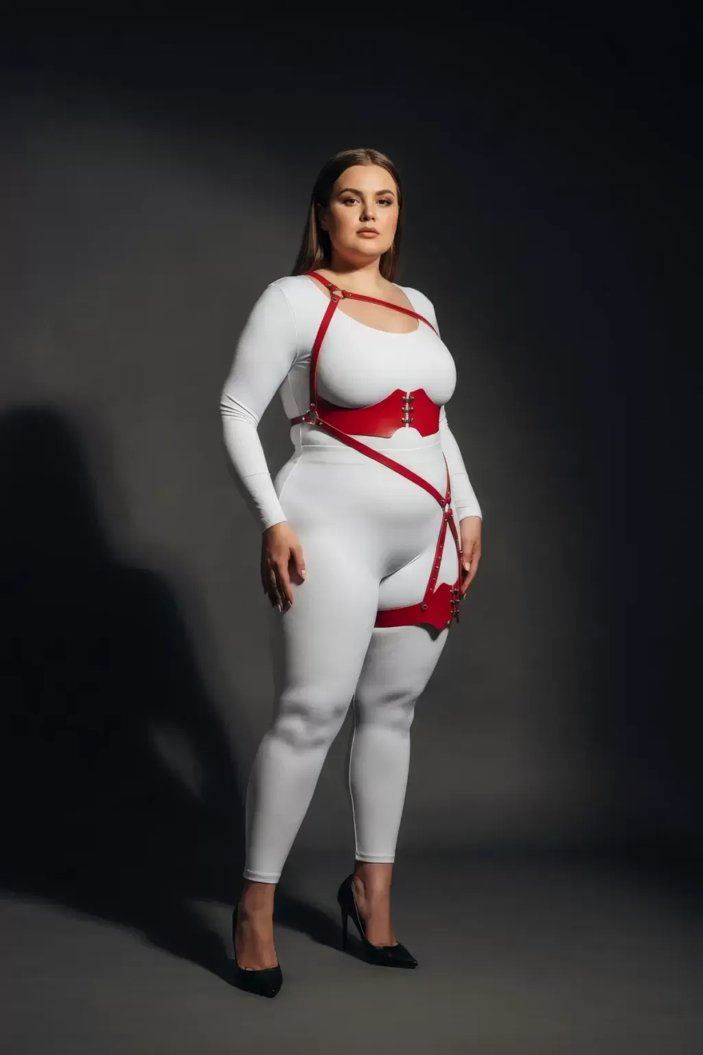 Büyük Beden Kırmızı Kadın Deri Harness Takım Jartiyer Detaylı Fantazi Aksesuar - APFT1372