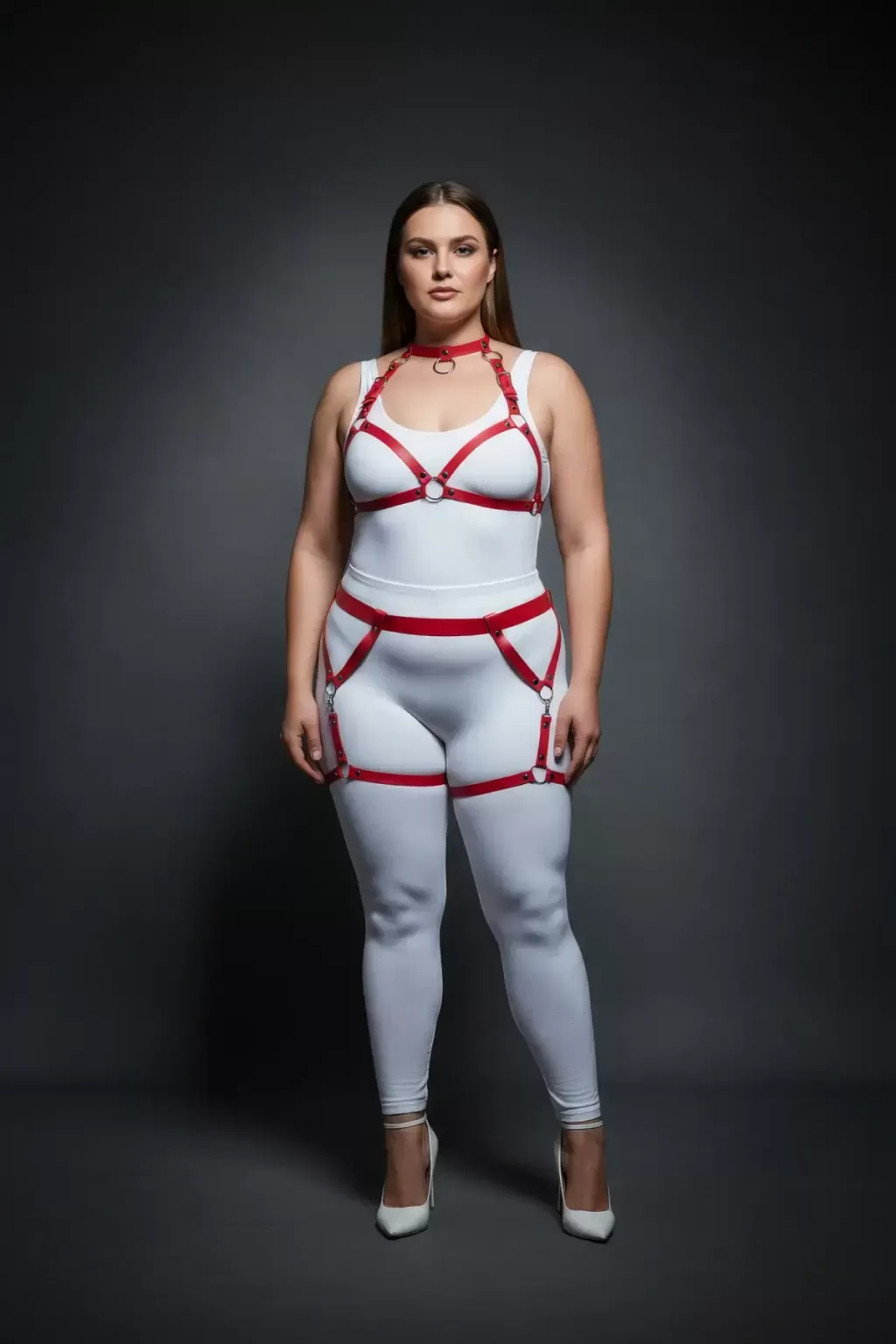 Büyük Beden Kırmızı Kadın Deri Harness Takım Jartiyerli Halka Detaylı - APFT478