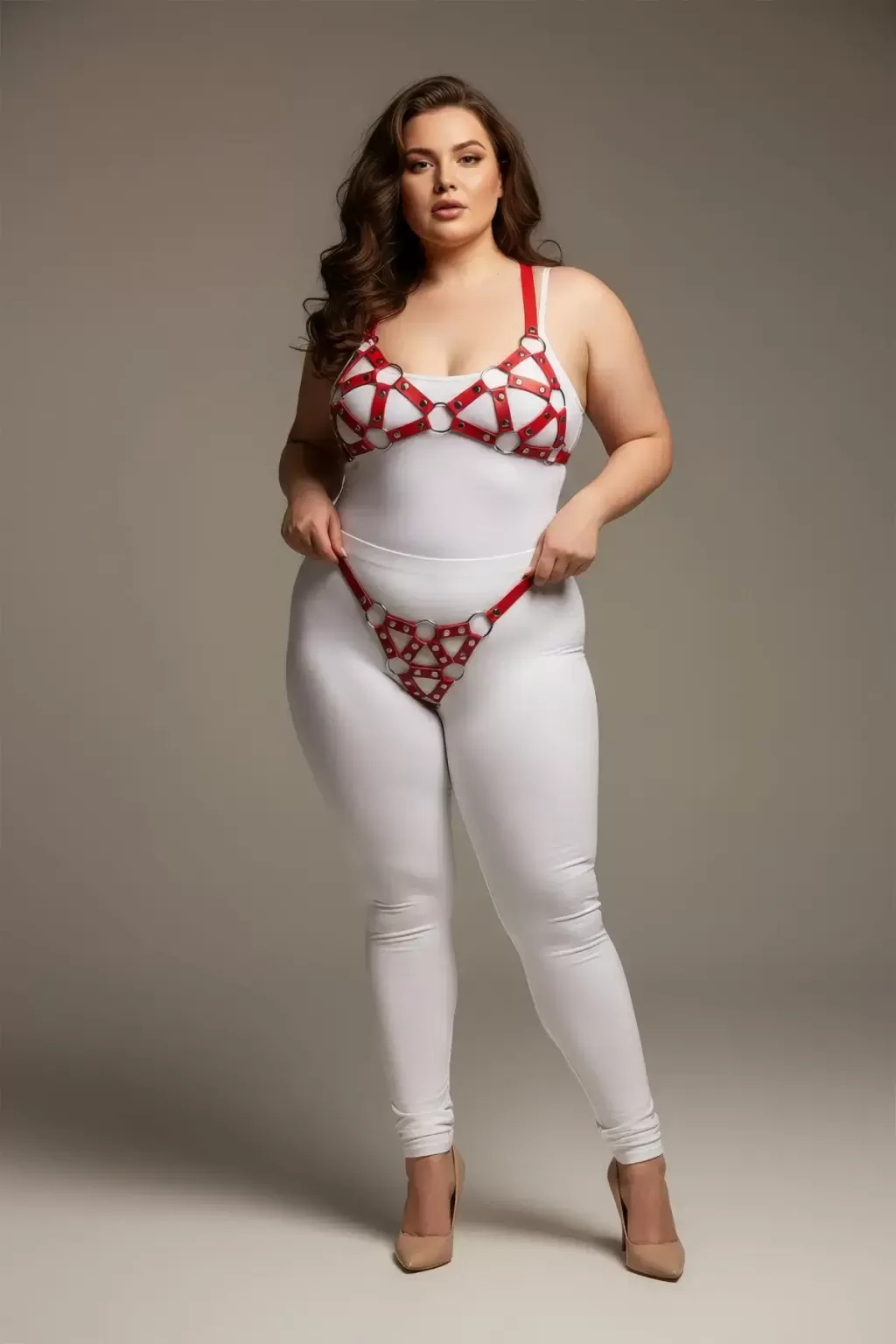 Büyük Beden Kırmızı Kadın Deri Harness Takım Seksi Halka Detaylı - APFT422