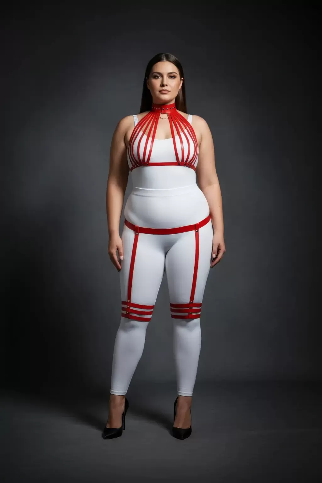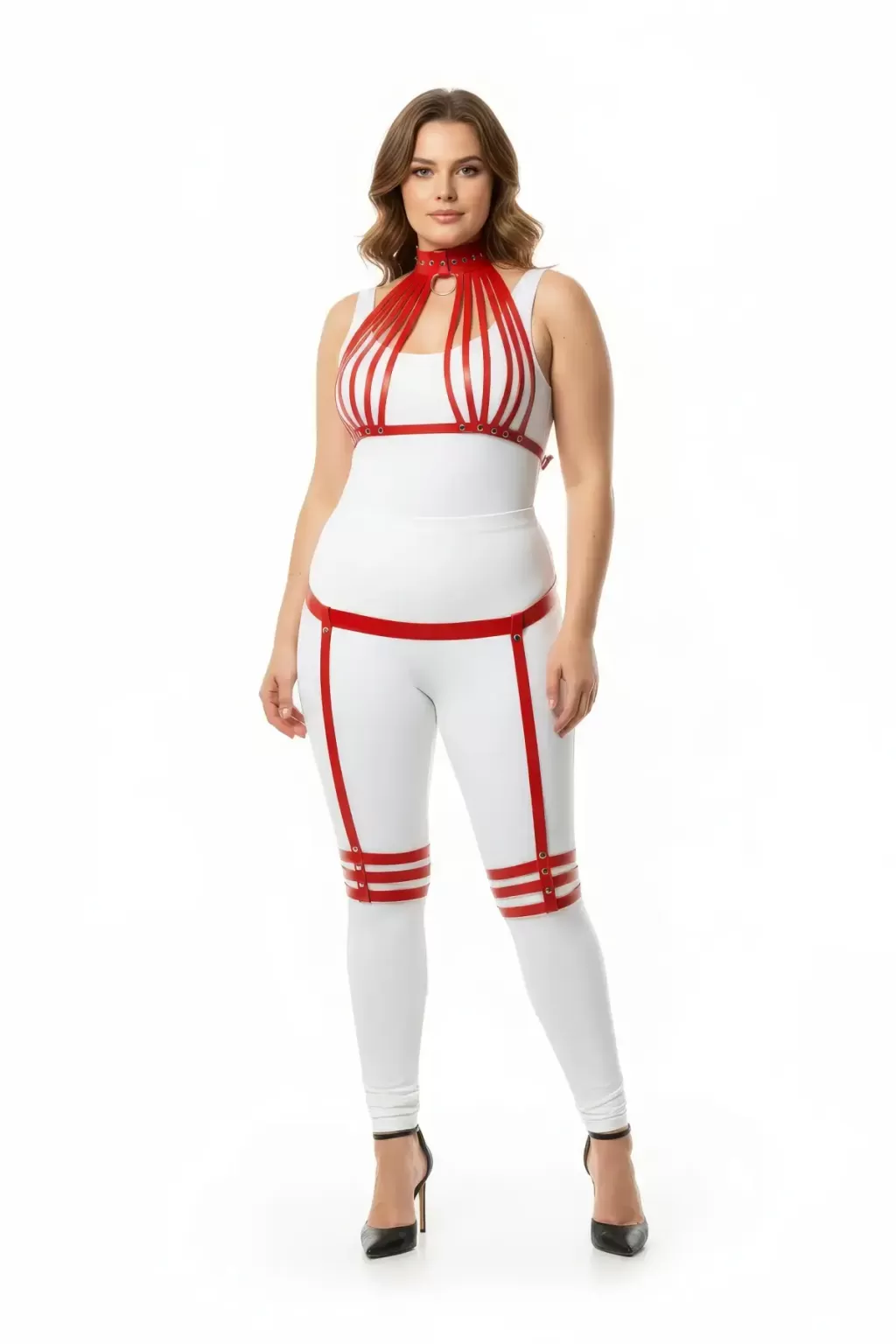 Büyük Beden Kırmızı Kadın Deri Harness Takım Seksi Jartiyer Detaylı - APFT552