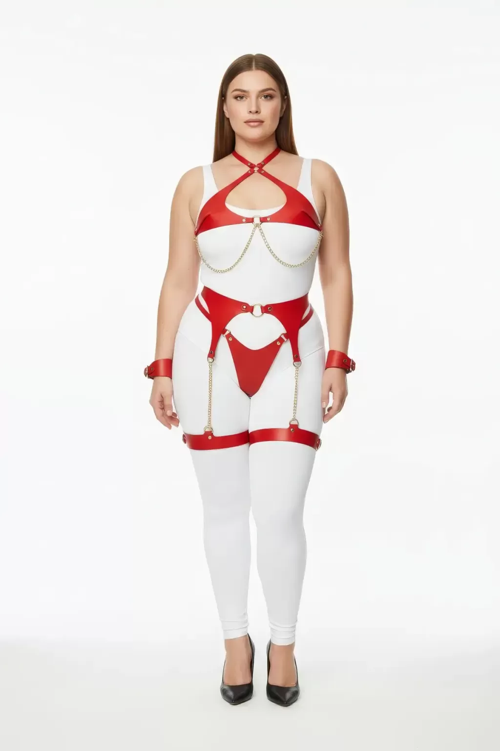 Büyük Beden Kırmızı Kadın Deri Harness Takım Zincir Detaylı Jartiyerli - APFT1219