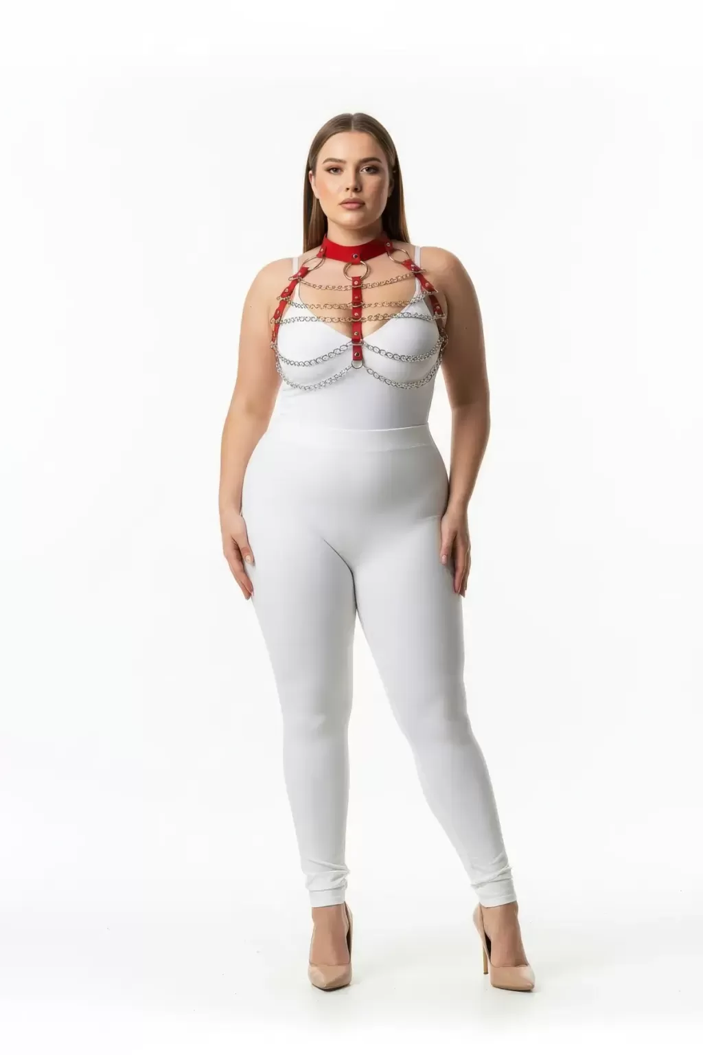 Büyük Beden Kırmızı Kadın Deri Harness Takım Zincir Detaylı Şık Aksesuar - APFT1285