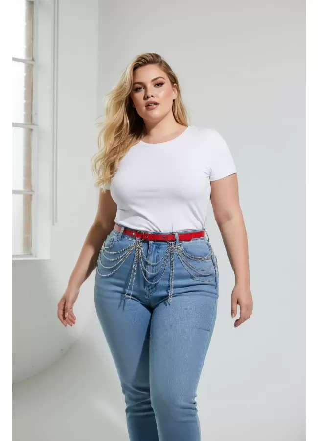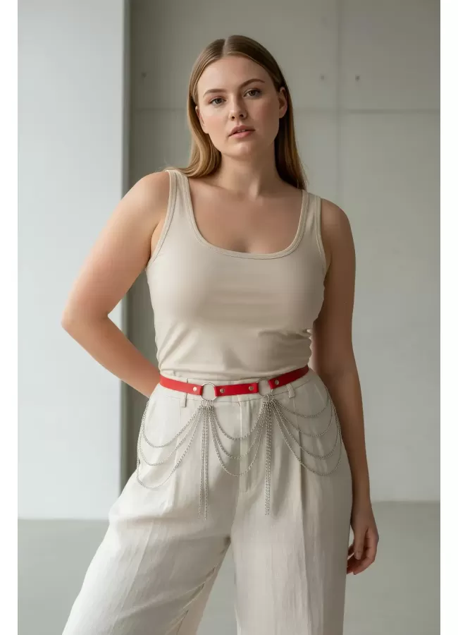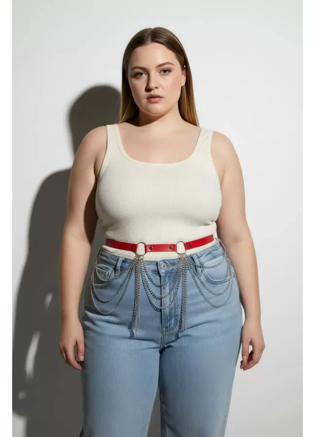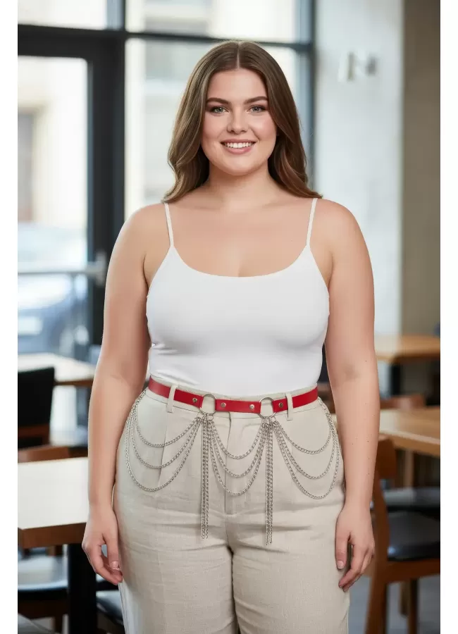 Büyük Beden Kırmızı Kadın Deri Kemer Zincir Detaylı Kombin Aksesuarı - APFT729