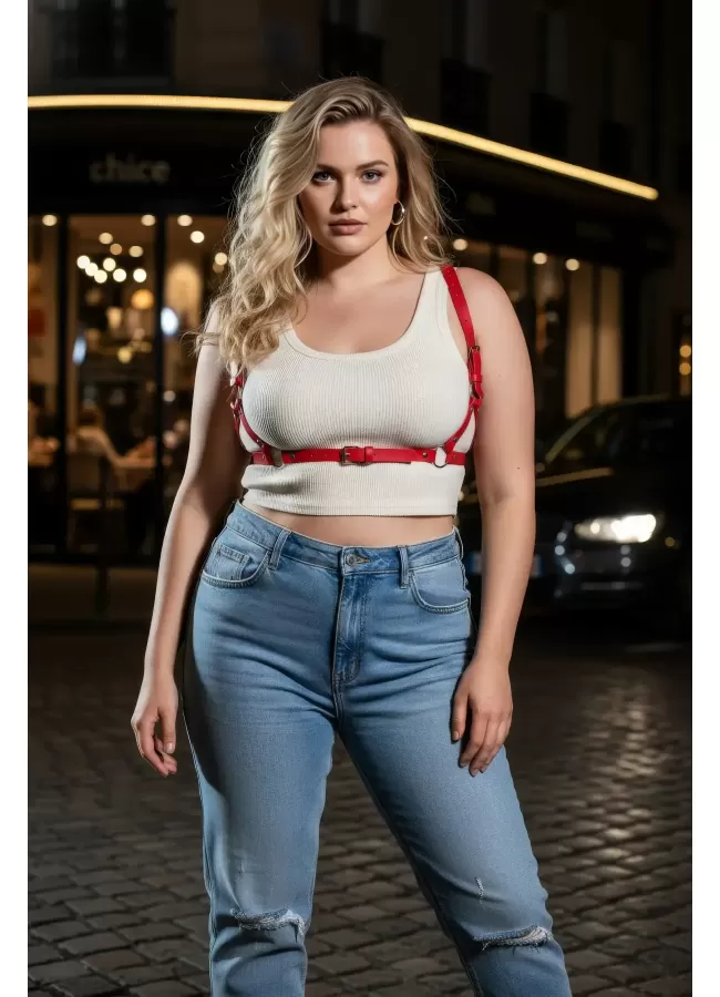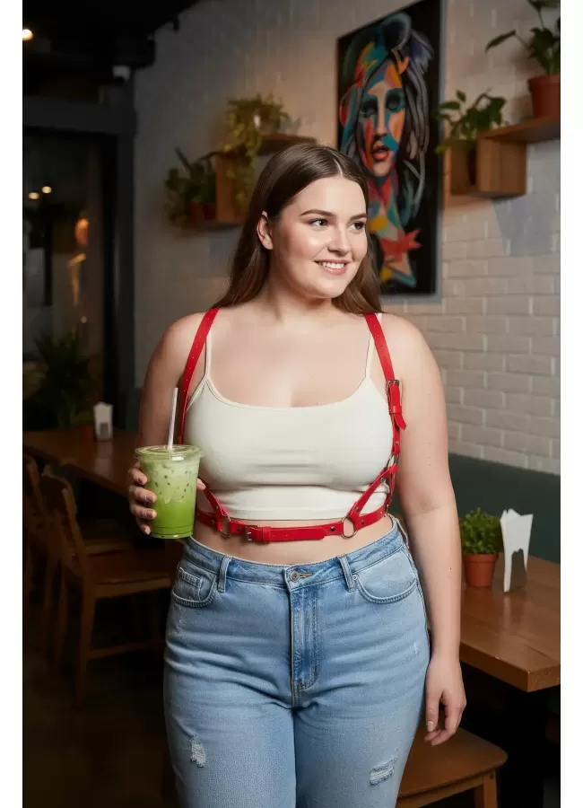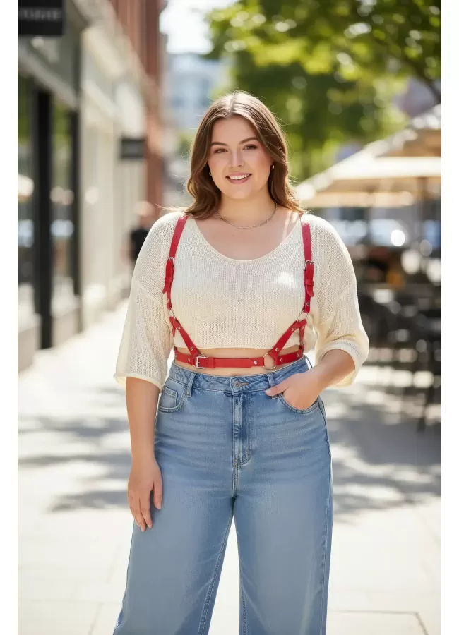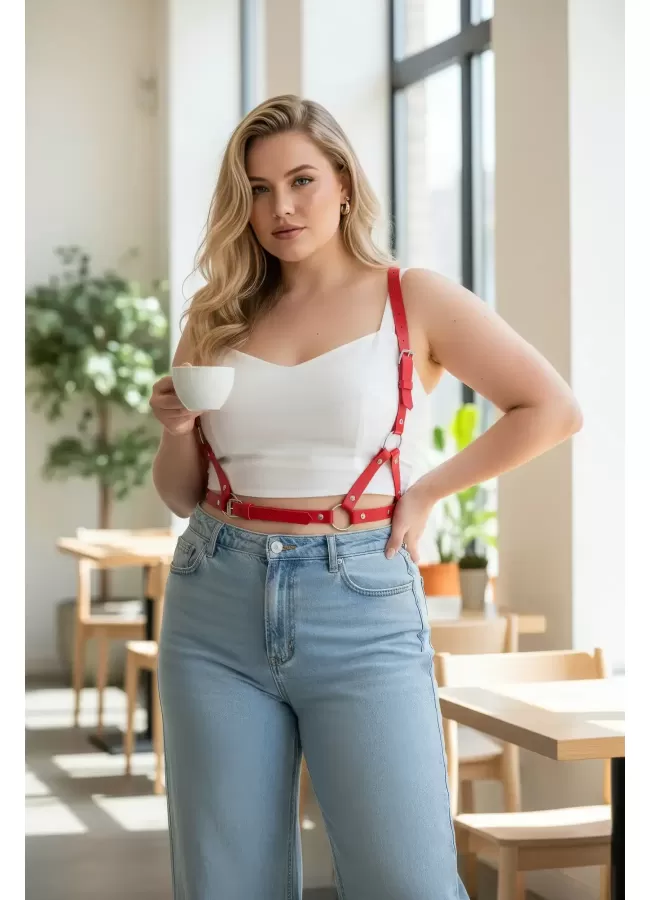 Büyük Beden Kırmızı Kadın Kemer Deri Harness Zincir Detaylı Vücut Aksesuarı - APFT9