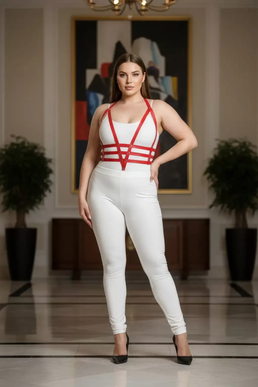 Büyük Beden Kırmızı Kadın Harness Takım Ayarlanabilir Deri Vücut Aksesuarı - APFT237