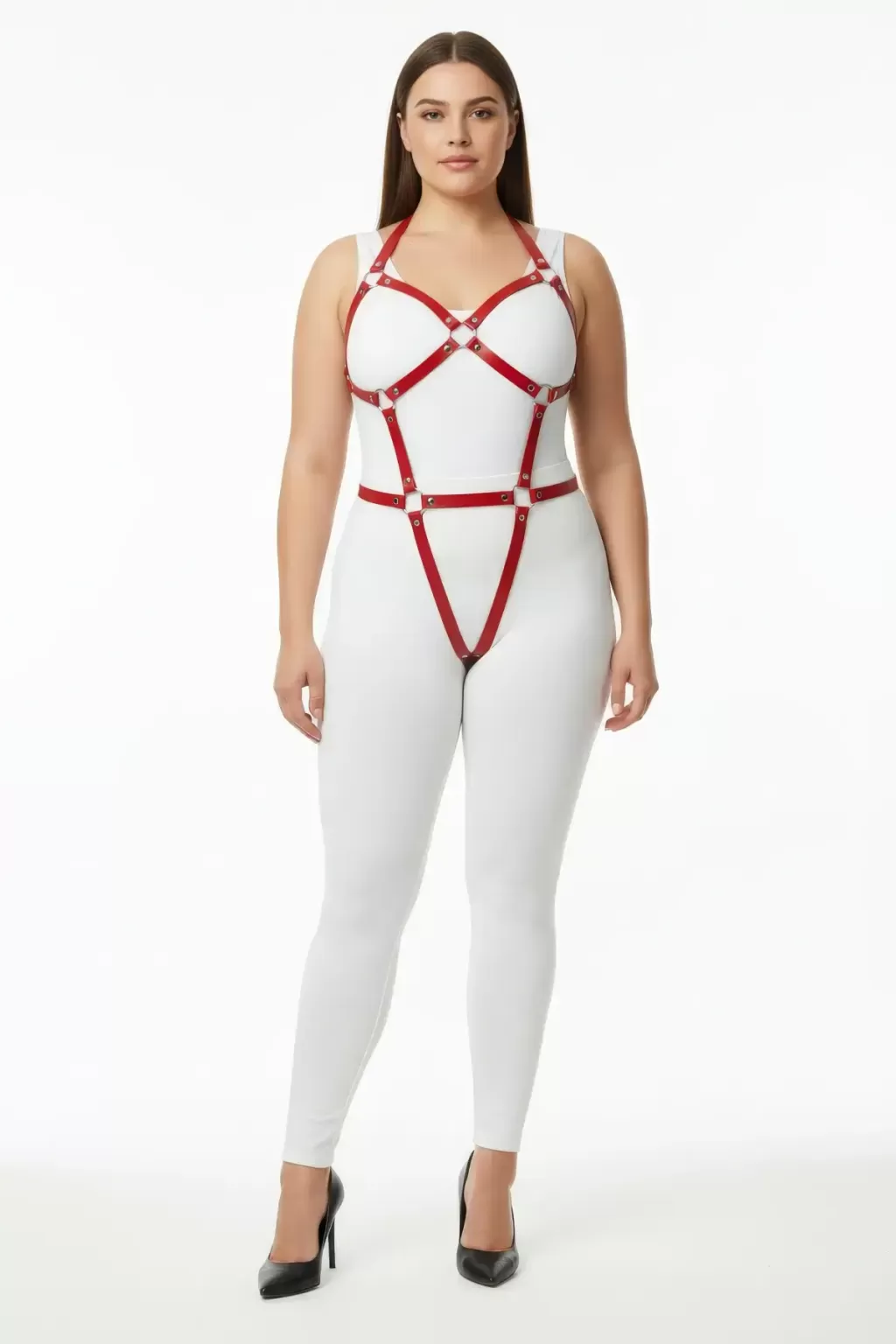 Büyük Beden Kırmızı Kadın Harness Takım Full Body Deri Fantazi Aksesuarı - APFT759