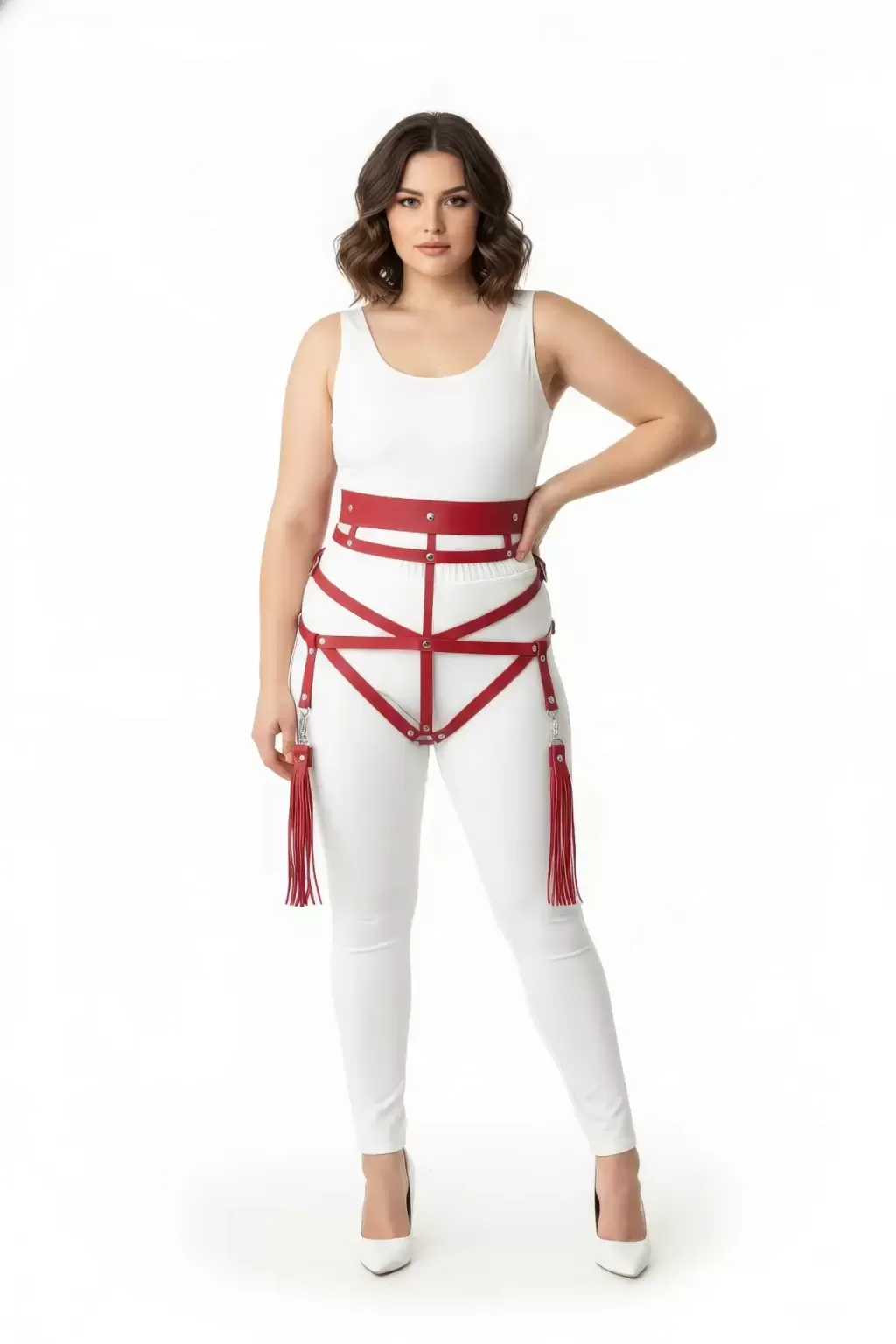 Büyük Beden Kırmızı Kadın Harness Takım Püskül Detaylı Deri Vücut Aksesuarı - APFT397