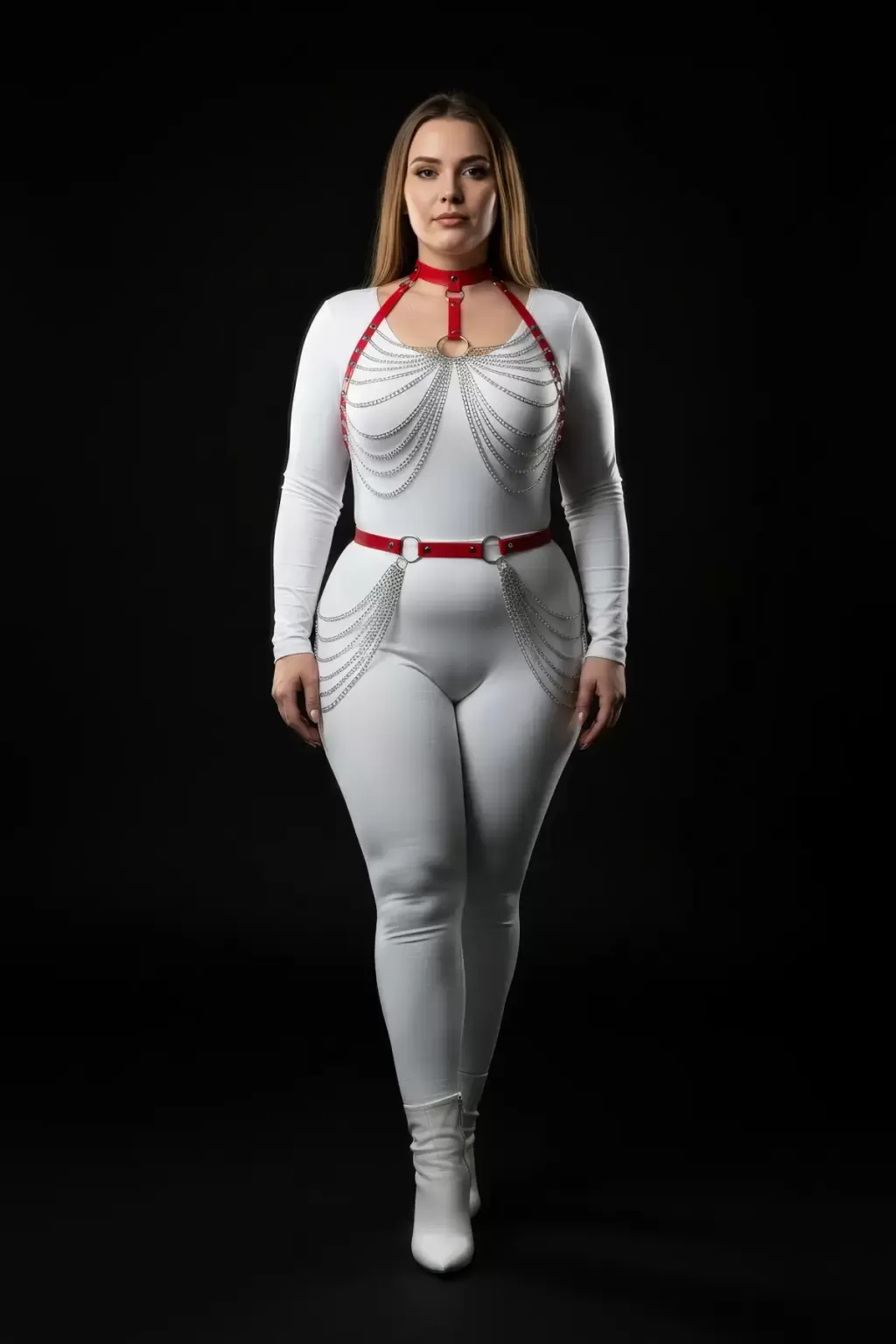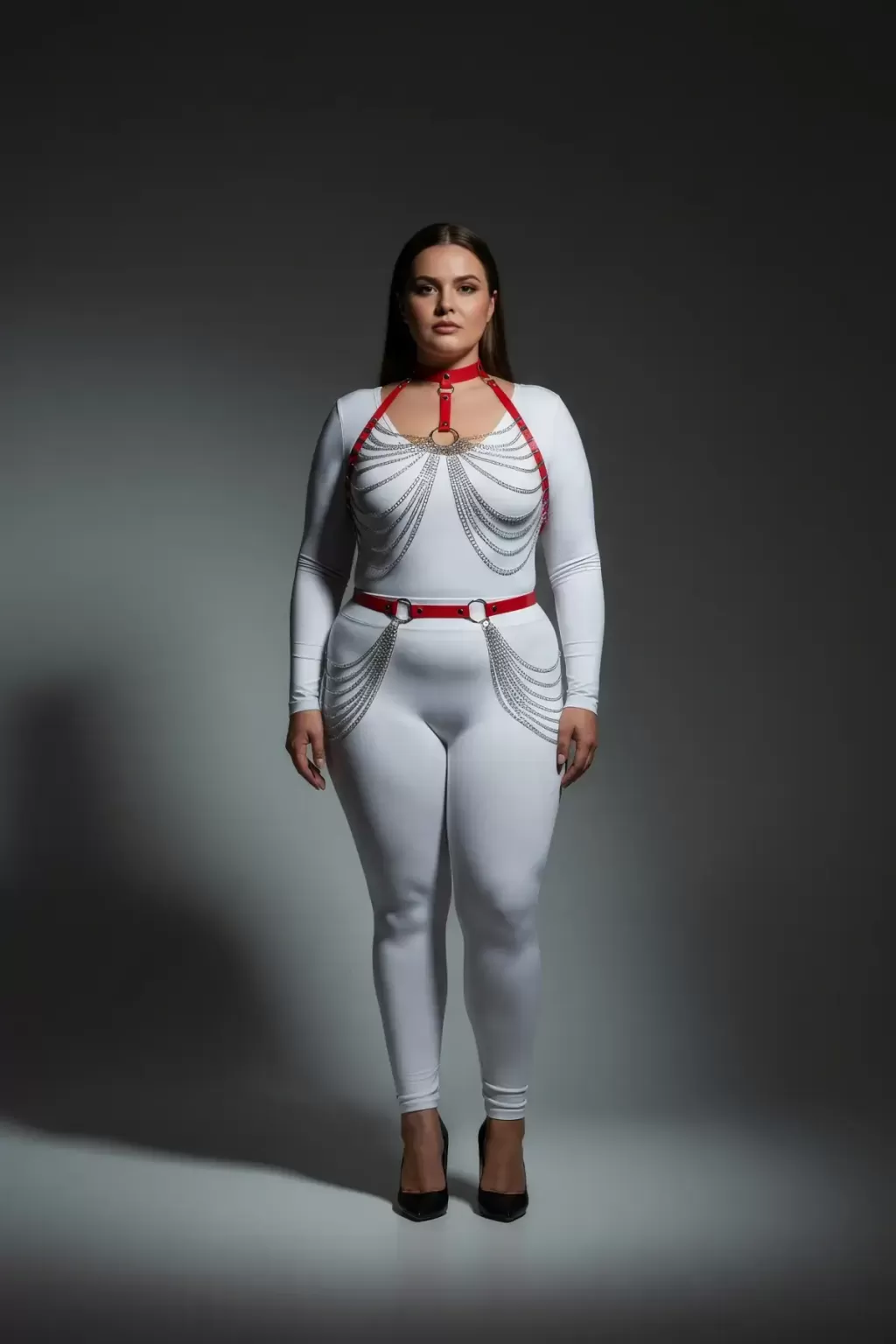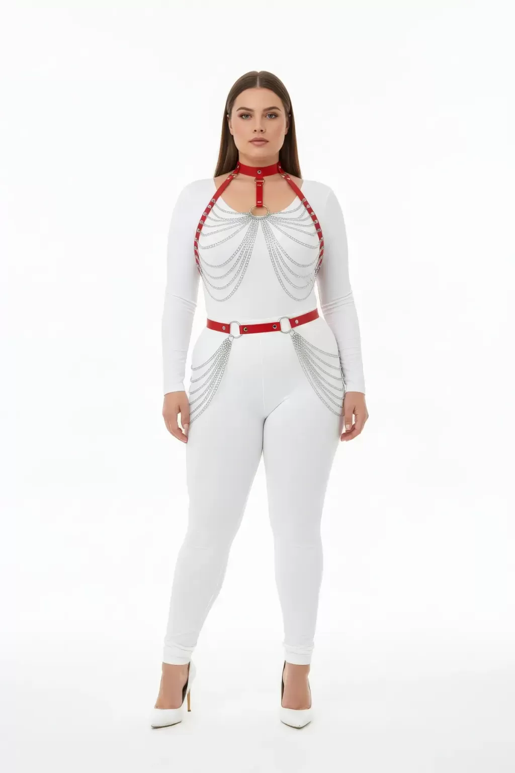 Büyük Beden Kırmızı Kadın Harness Takım Zincir Detaylı Deri Fantezi Vücut Aksesuarı - APFT701