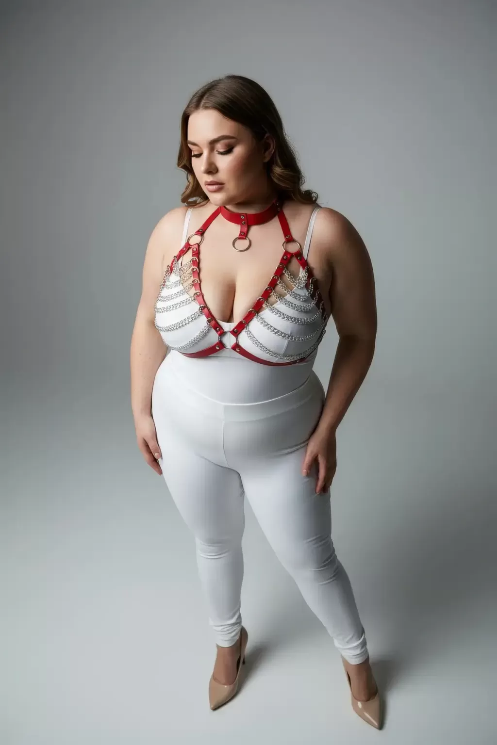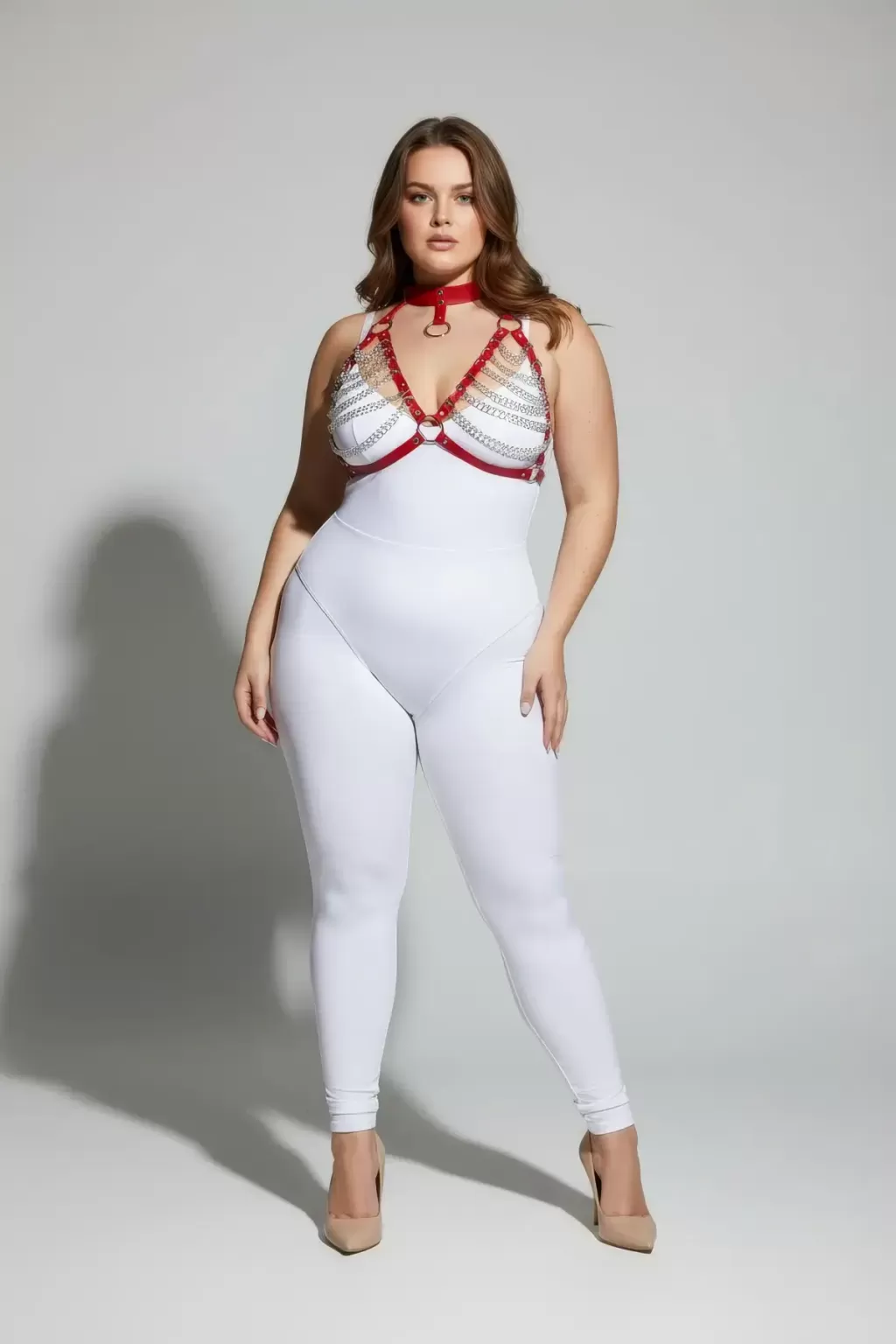 Büyük Beden Kırmızı Kadın Harness Takım Zincir Detaylı Fantezi Choker Yaka - APFT945