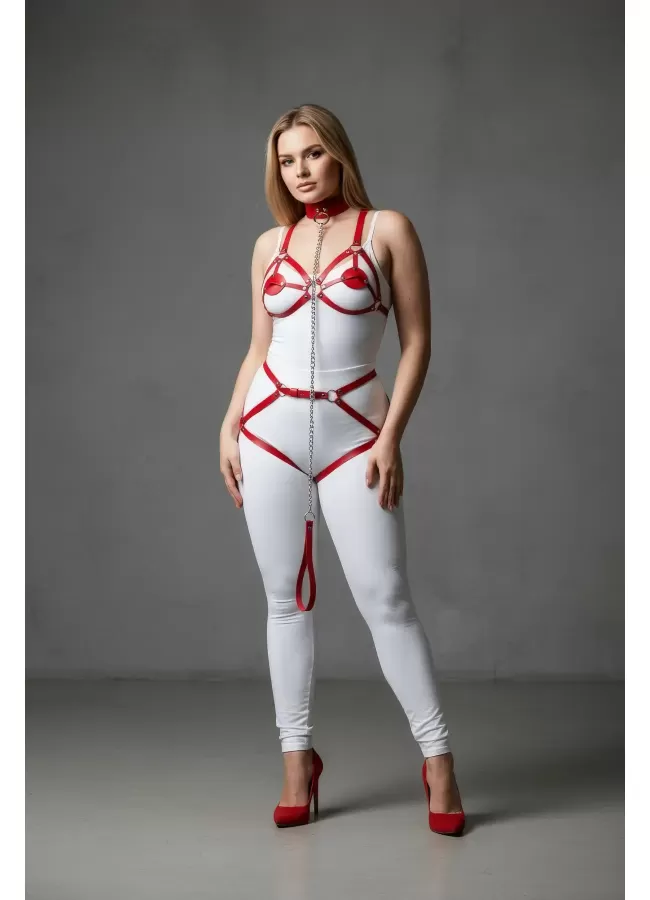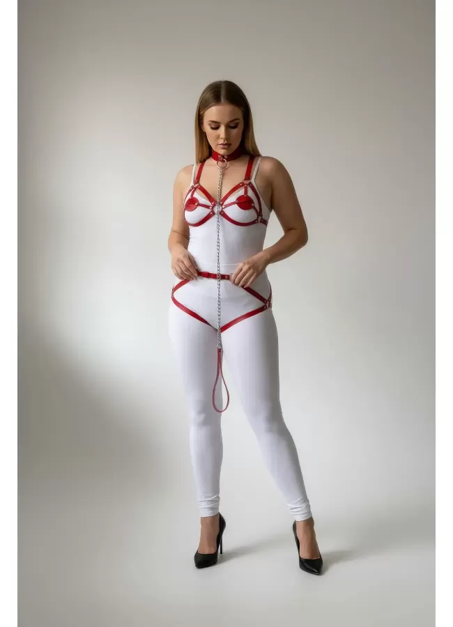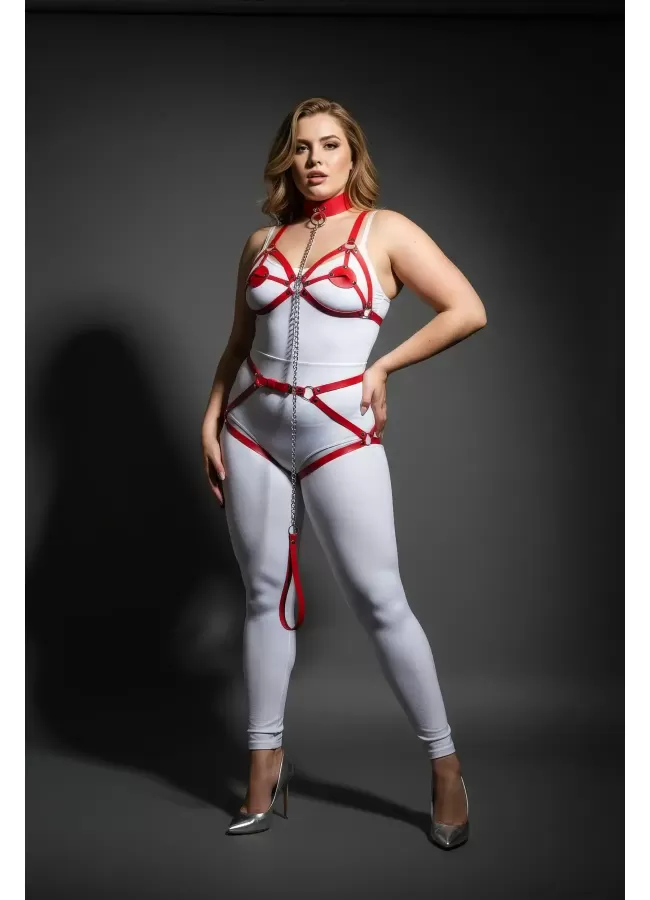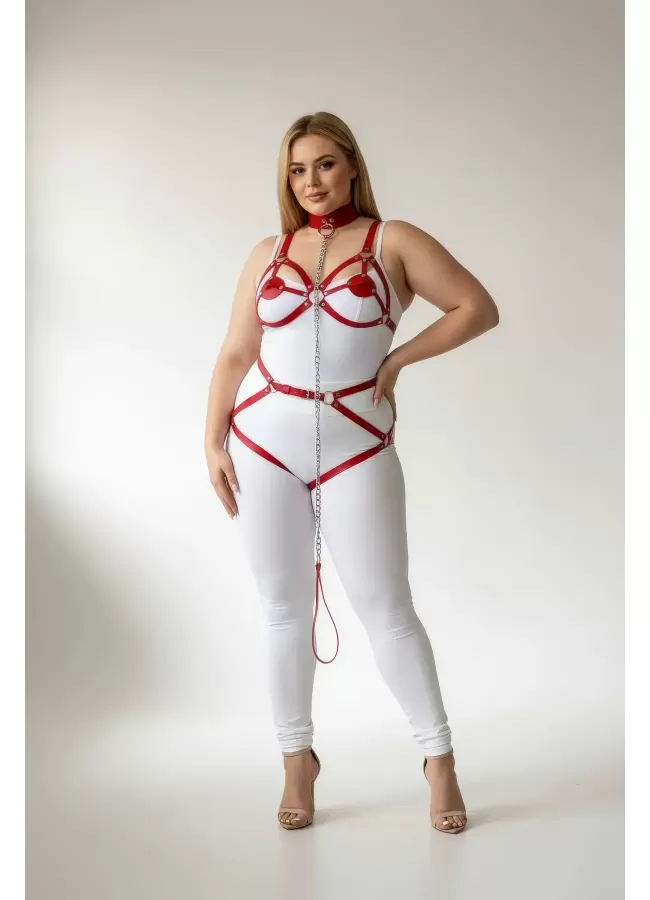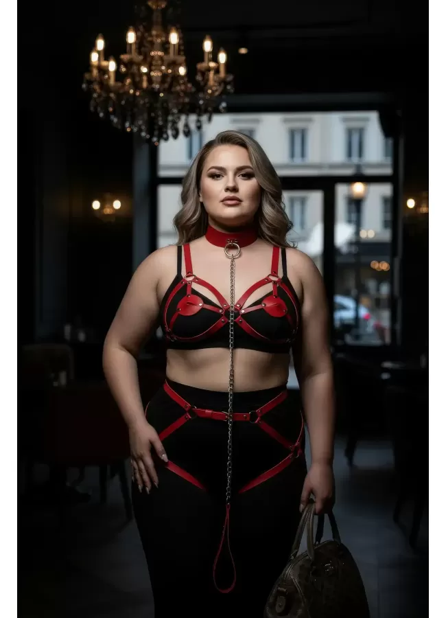 Büyük Beden Kırmızı Kadın Jartiyer Harness Zincir Detaylı Deri Tam Vücut Aksesuarı - APFT311