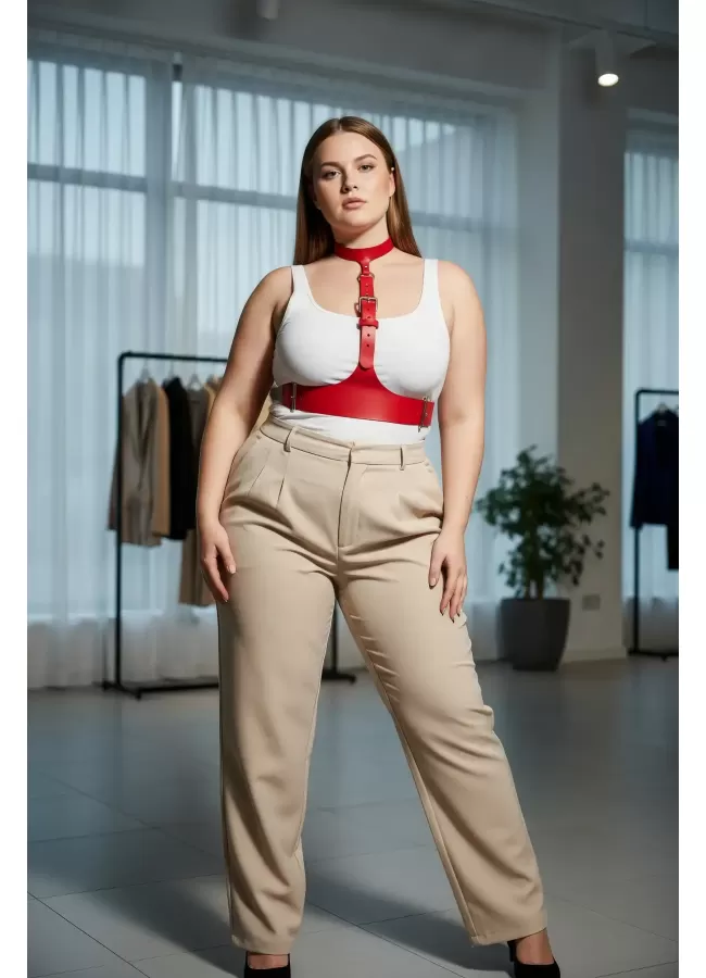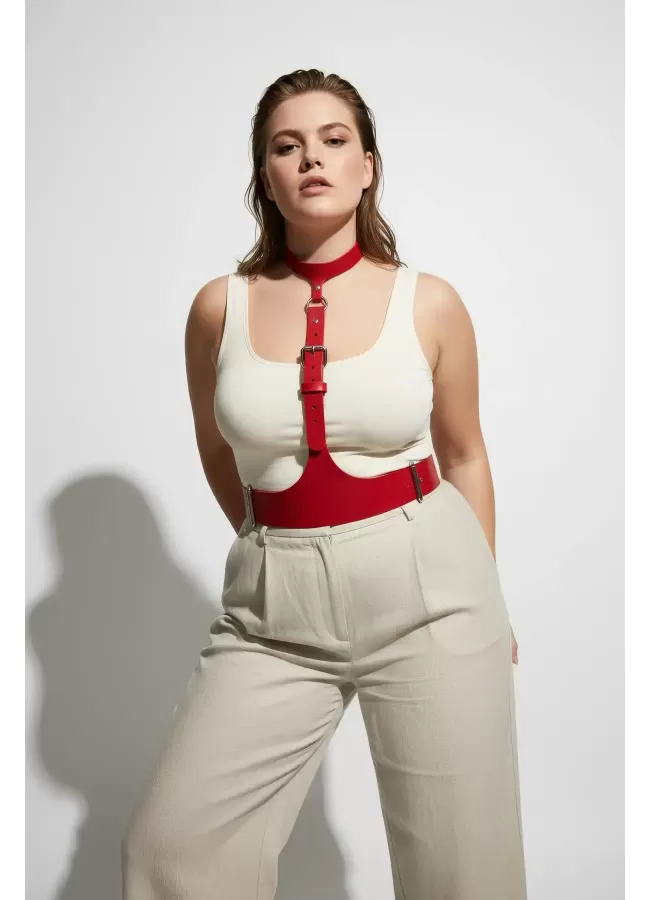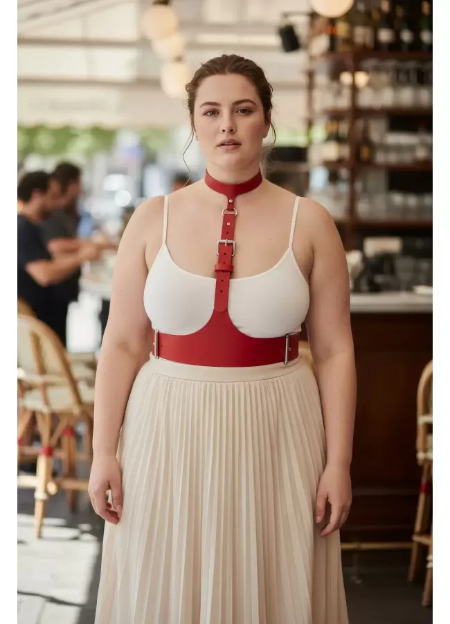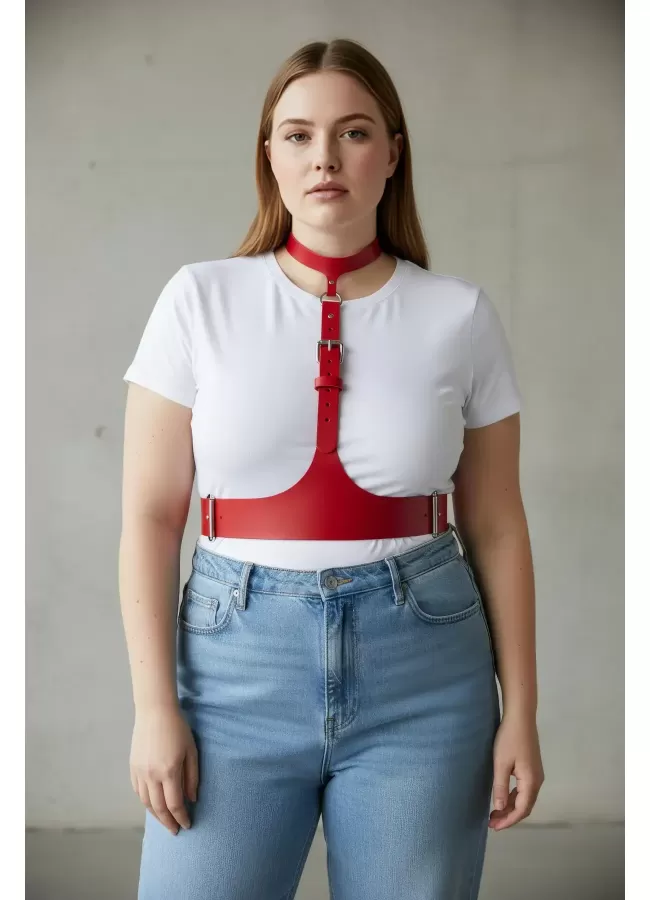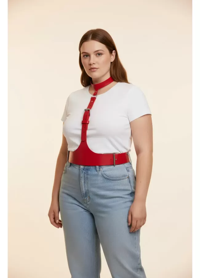 Büyük Beden Kırmızı Kadın Kemer Deri Harness Zincir Detaylı Vücut Aksesuarı - APFT9