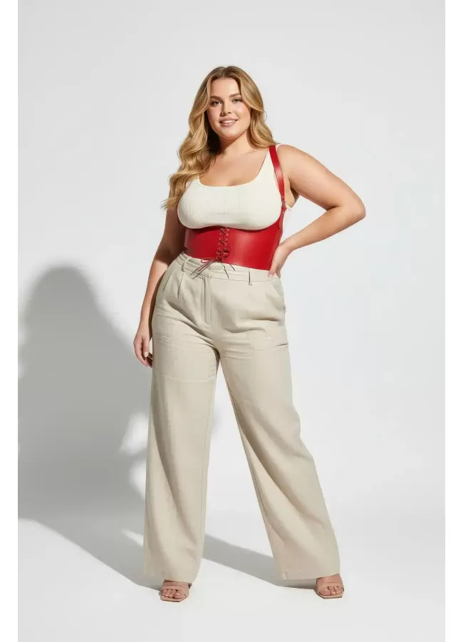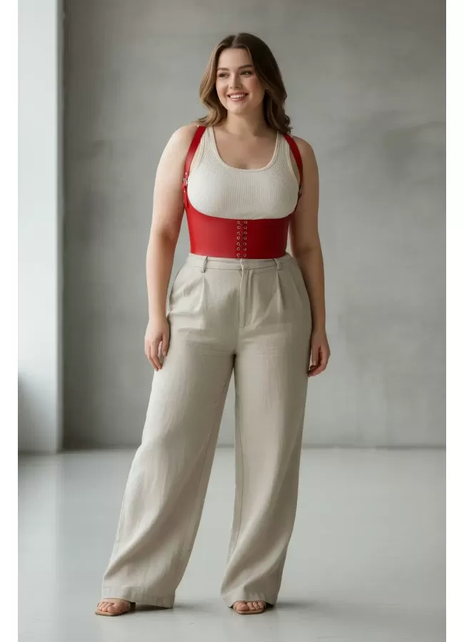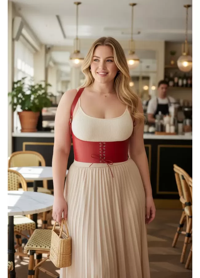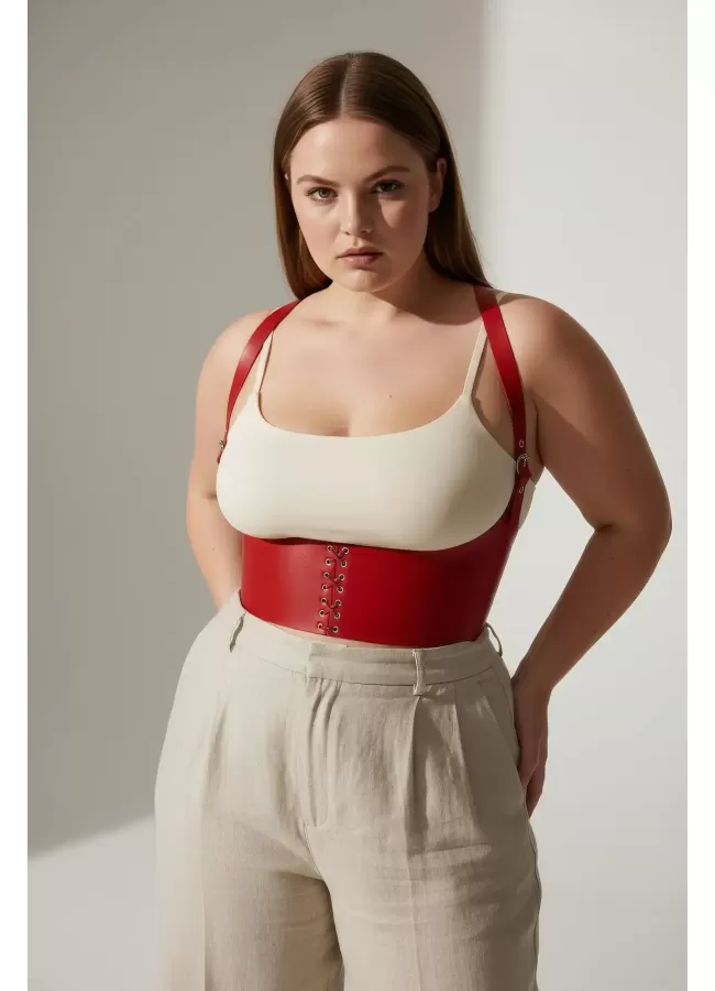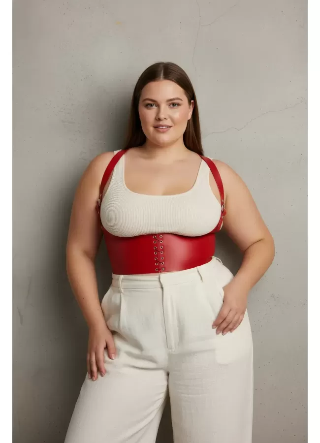 Büyük Beden Kırmızı Kadın Kemer Bağcıklı Korse Stili Omuz Askılı - APFT855