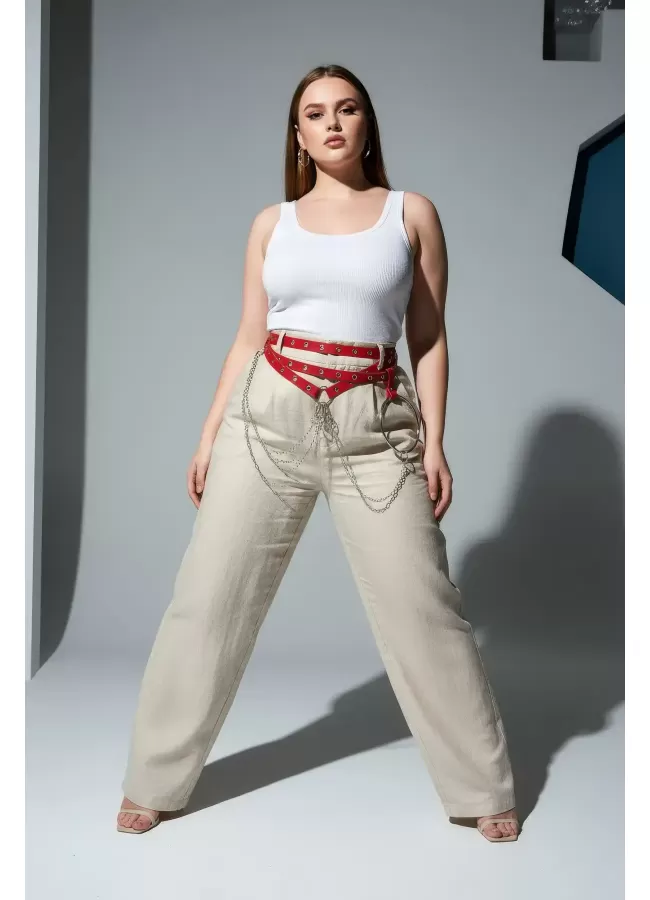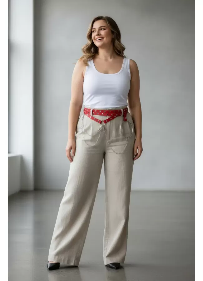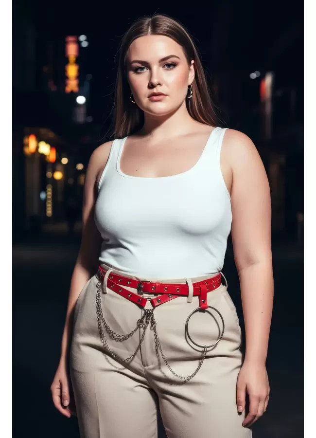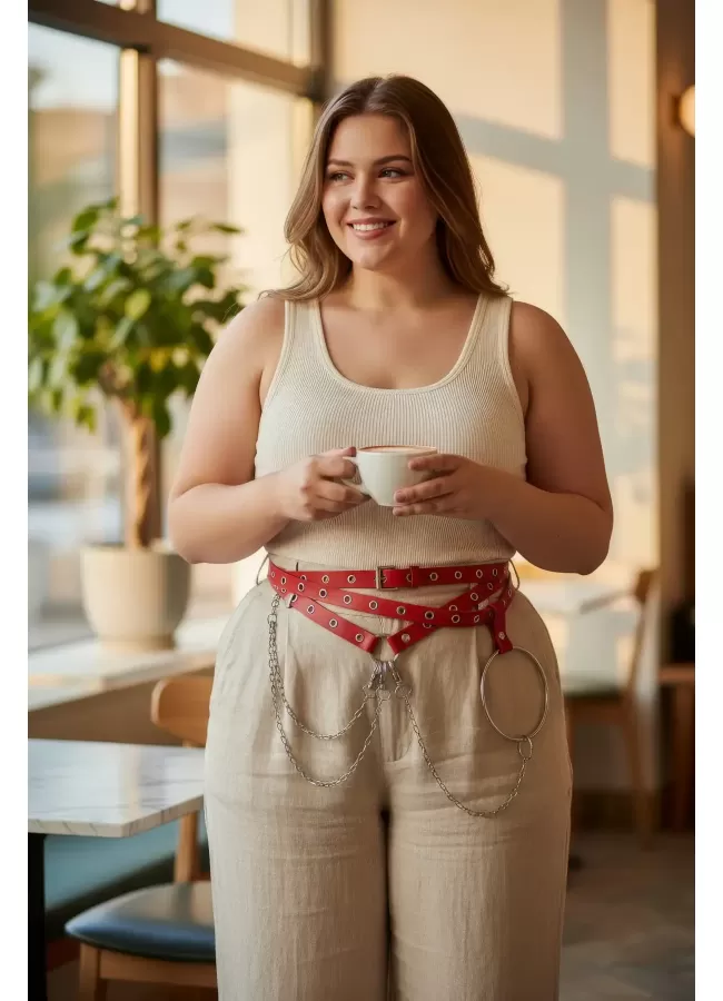 Büyük Beden Kırmızı Kadın Kemer Deri Harness Zincir Detaylı Vücut Aksesuarı - APFT9