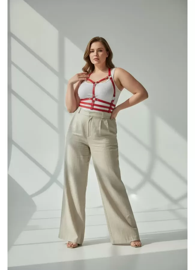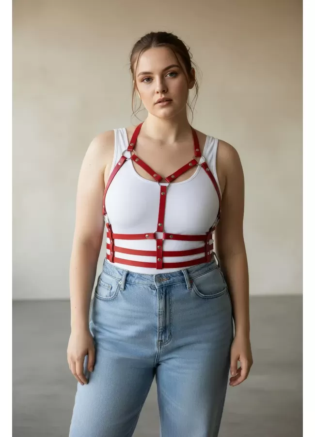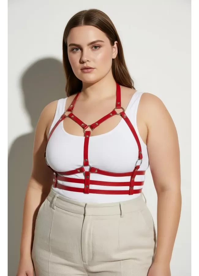 Büyük Beden Kırmızı Kadın Kemer Deri Harness Zincir Detaylı Vücut Aksesuarı - APFT9
