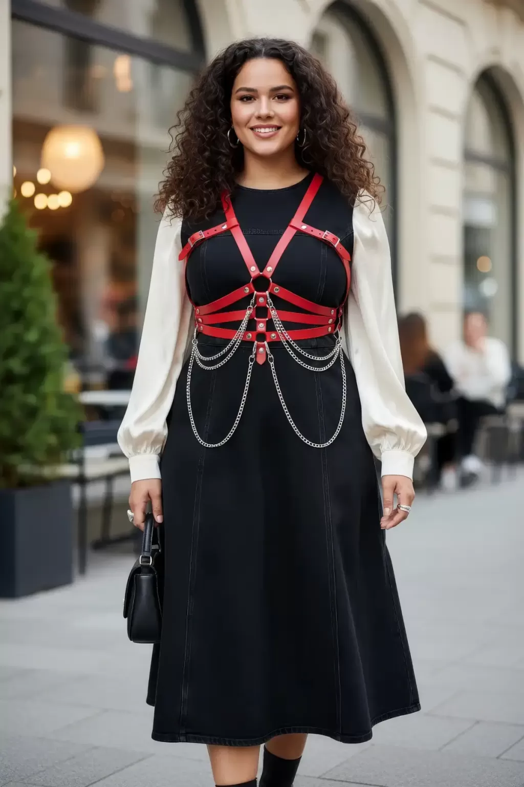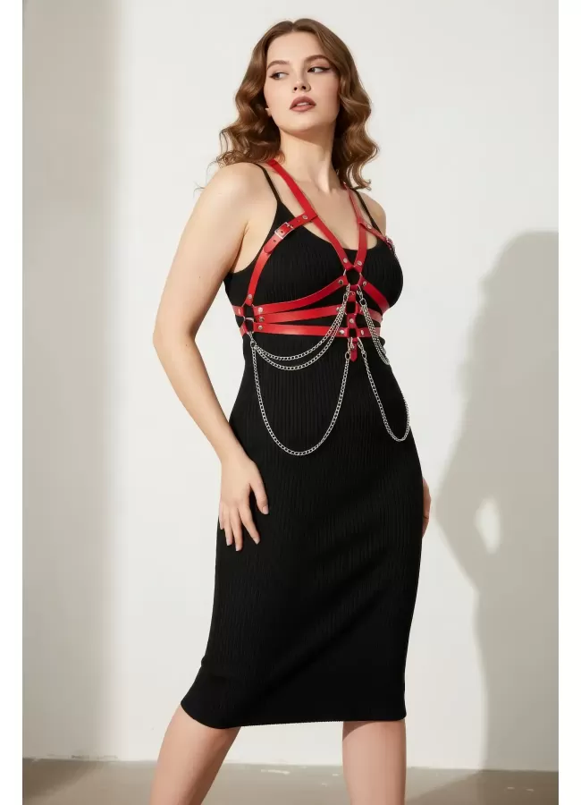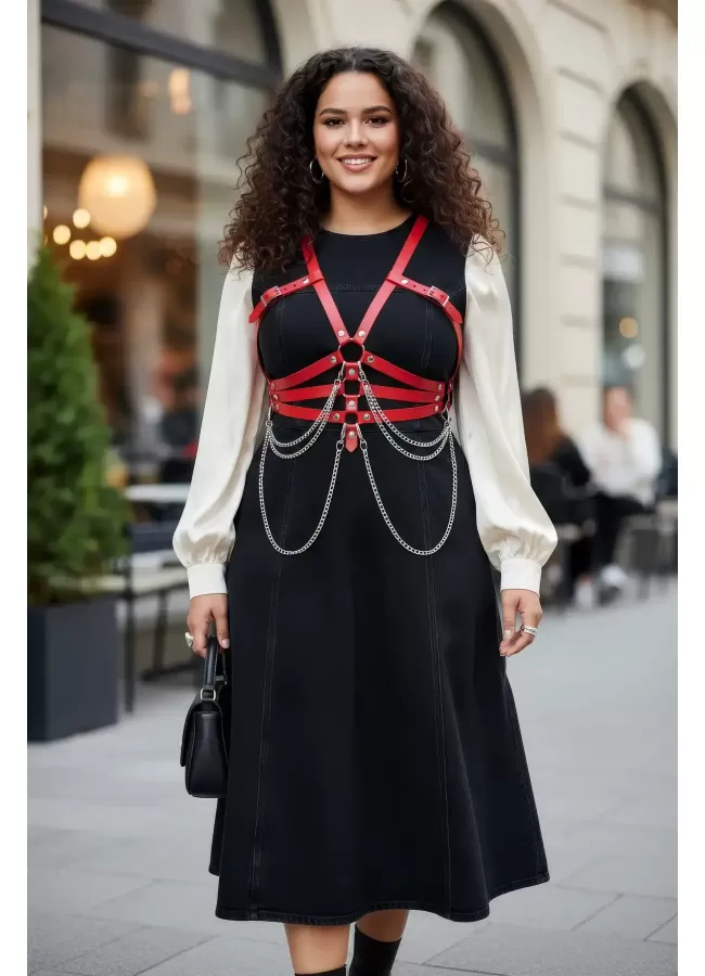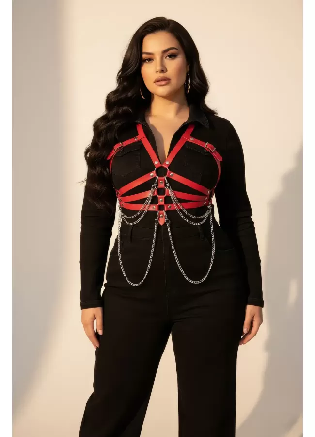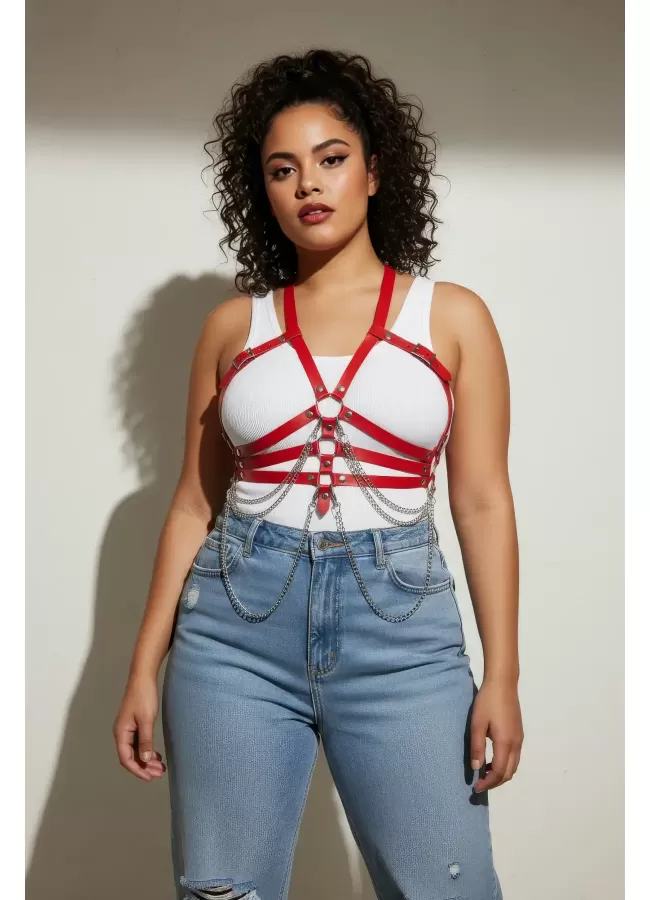Büyük Beden Kırmızı Kadın Kemer Deri Harness Zincir Detaylı Vücut Aksesuarı - APFT9