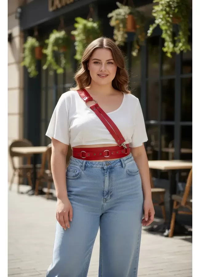 Büyük Beden Kırmızı Kadın Kemer Deri Harness Zincir Detaylı Vücut Aksesuarı - APFT9
