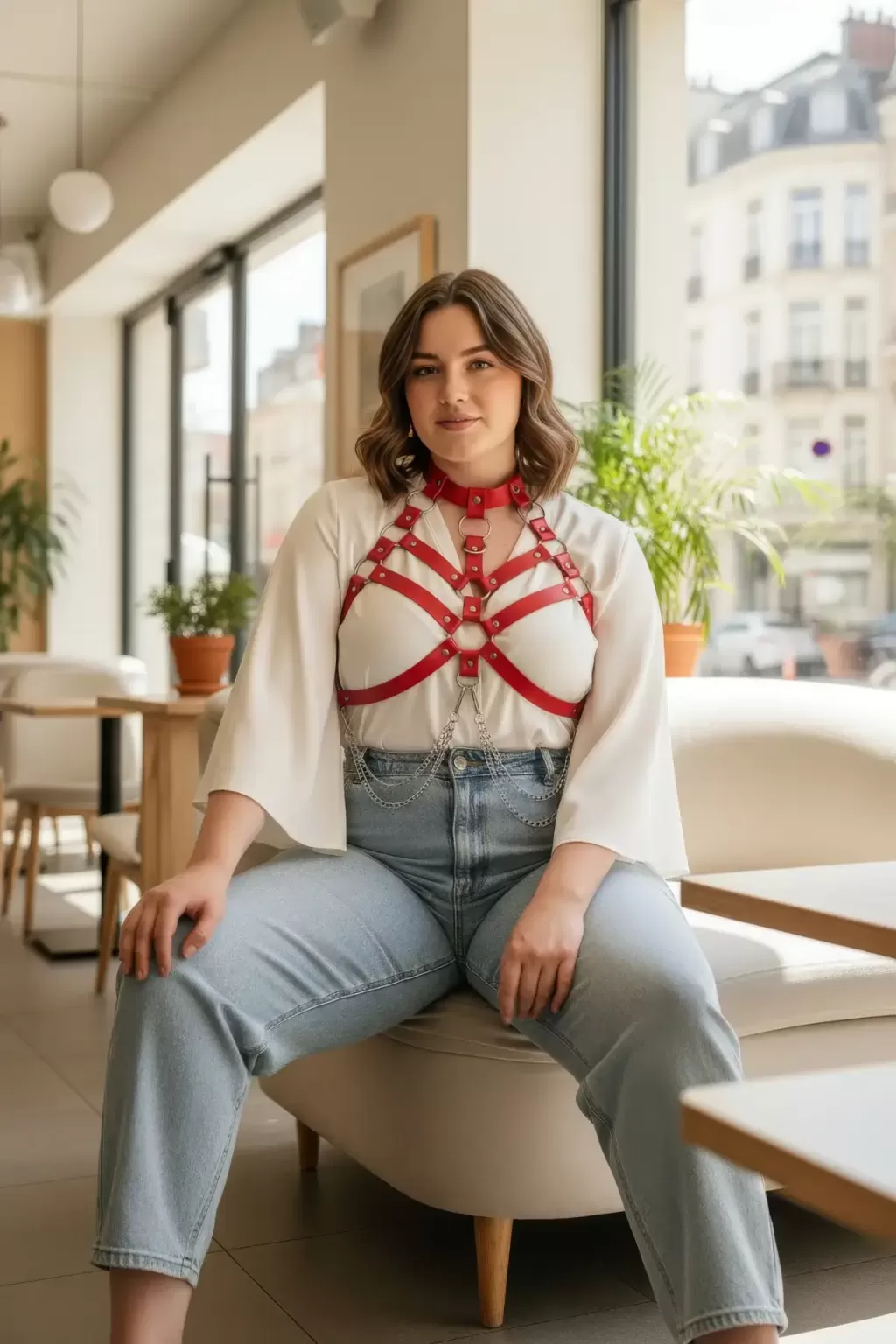 Büyük Beden Kırmızı Kadın Kemer, Harness Stilinde Göğüs Detaylı Deri Vücut Aksesuarı - APFT517