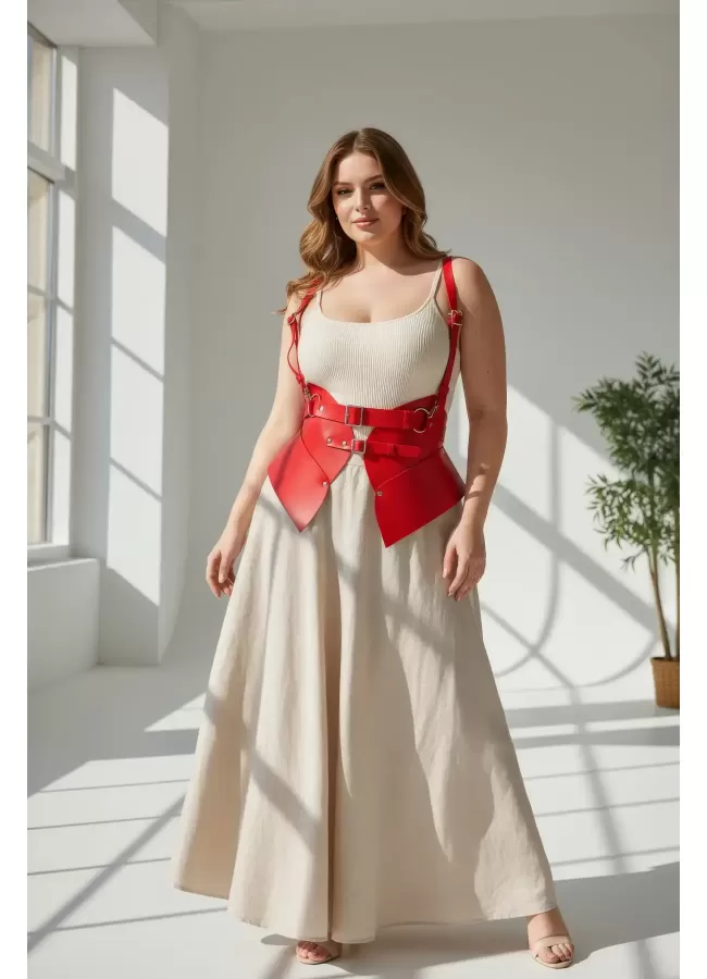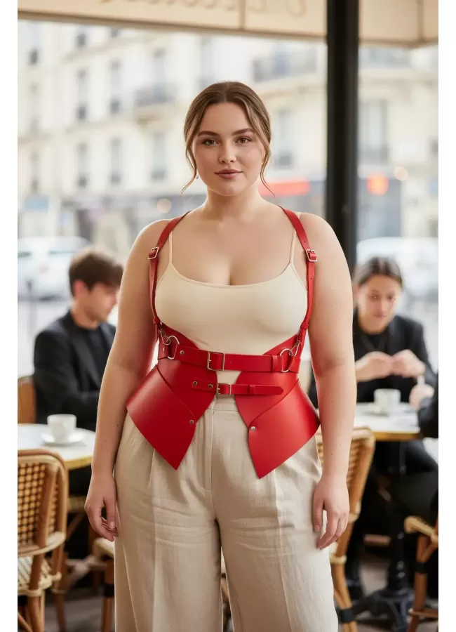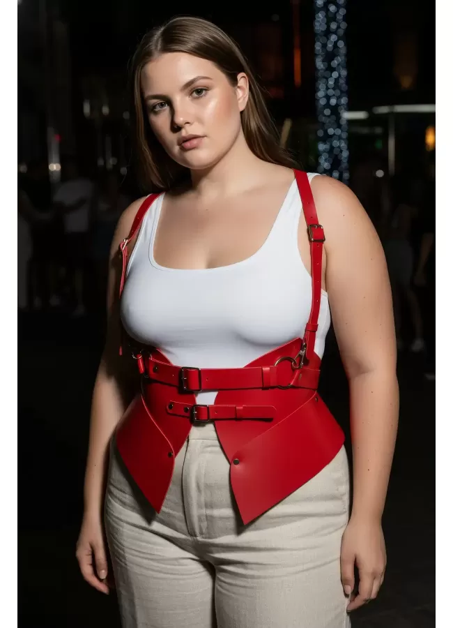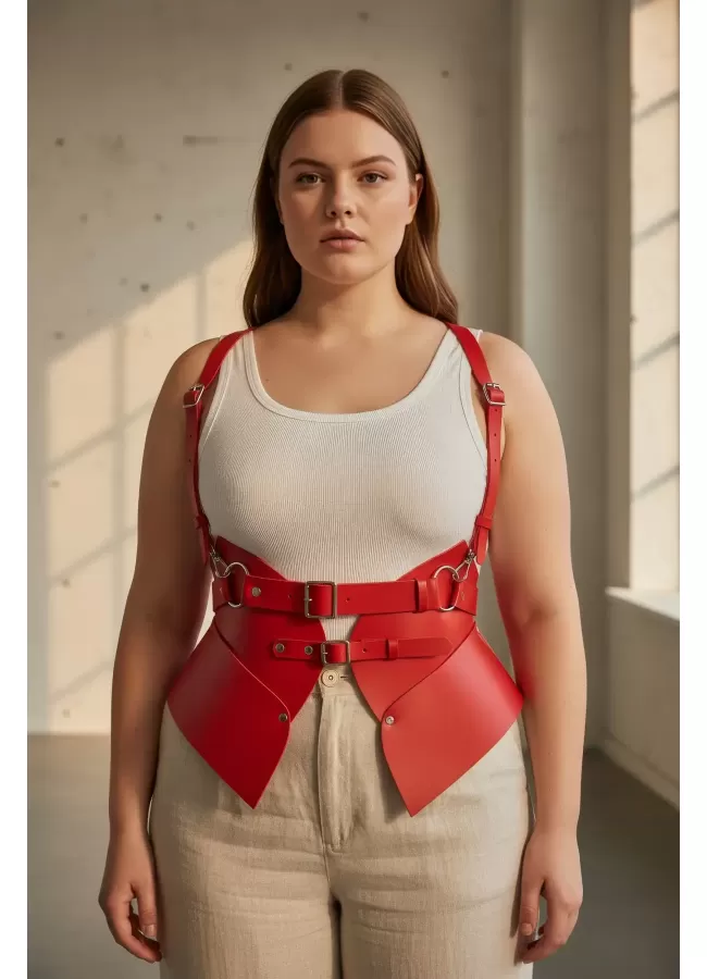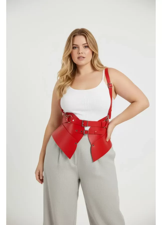 Büyük Beden Kırmızı Kadın Kemer Deri Harness Zincir Detaylı Vücut Aksesuarı - APFT9