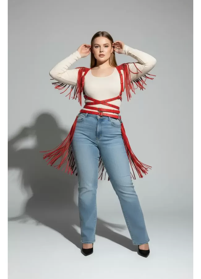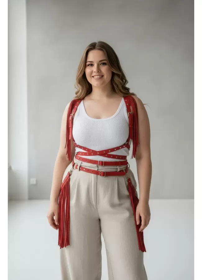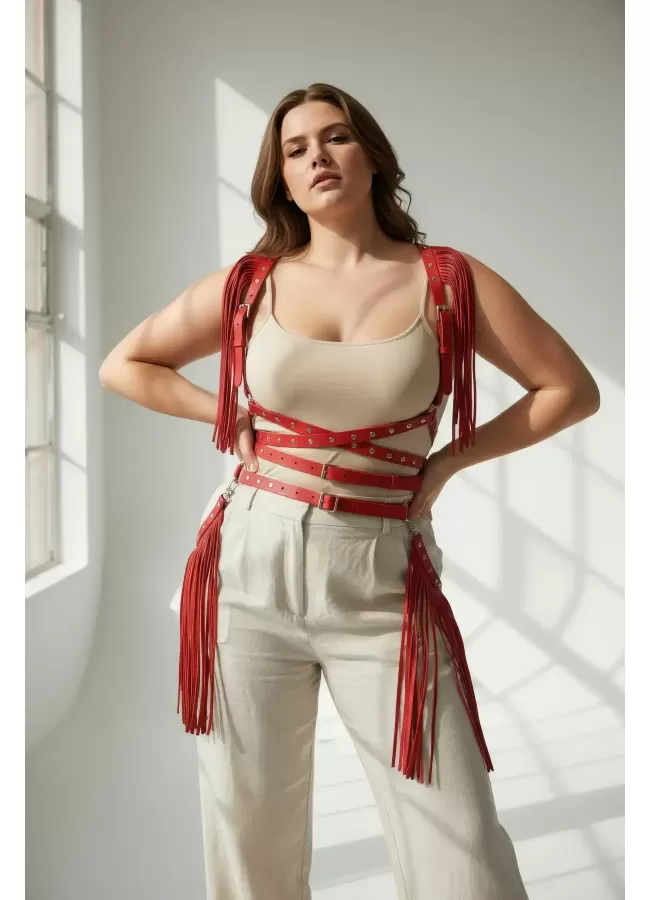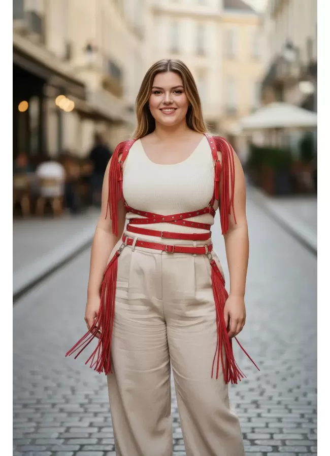 Büyük Beden Kırmızı Kadın Kemer Deri Harness Zincir Detaylı Vücut Aksesuarı - APFT9