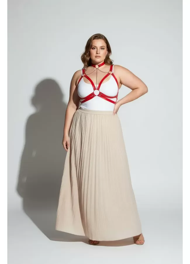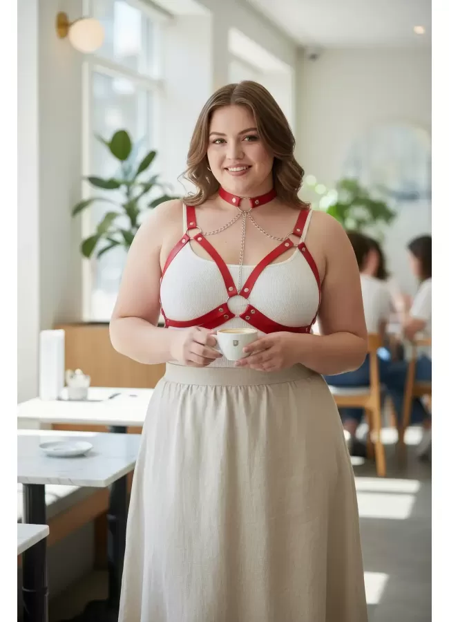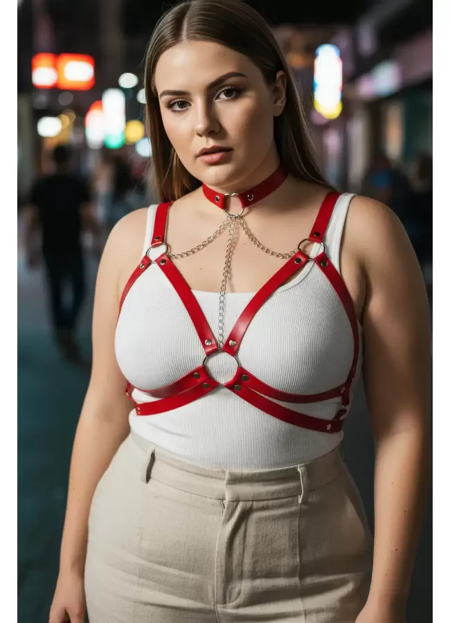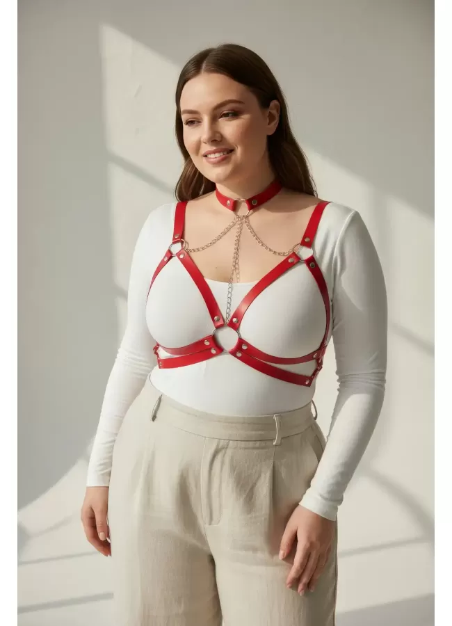 Büyük Beden Kırmızı Kadın Kemer Deri Harness Zincir Detaylı Vücut Aksesuarı - APFT9