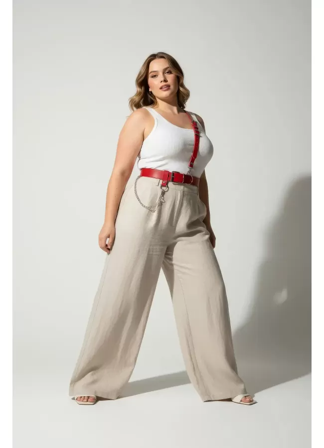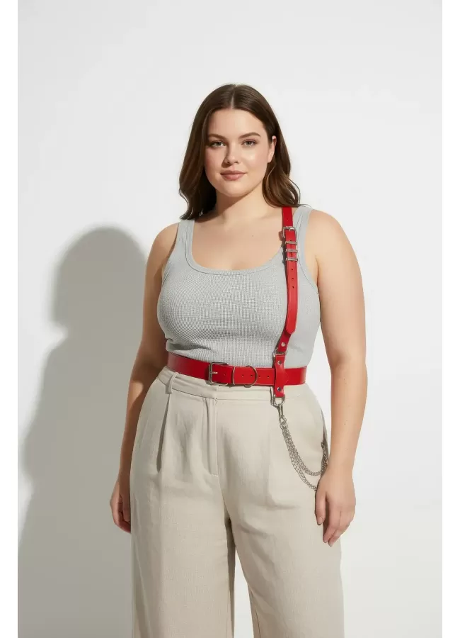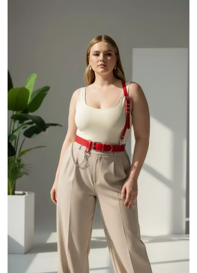 Büyük Beden Kırmızı Kadın Kemer Deri Harness Zincir Detaylı Vücut Aksesuarı - APFT9
