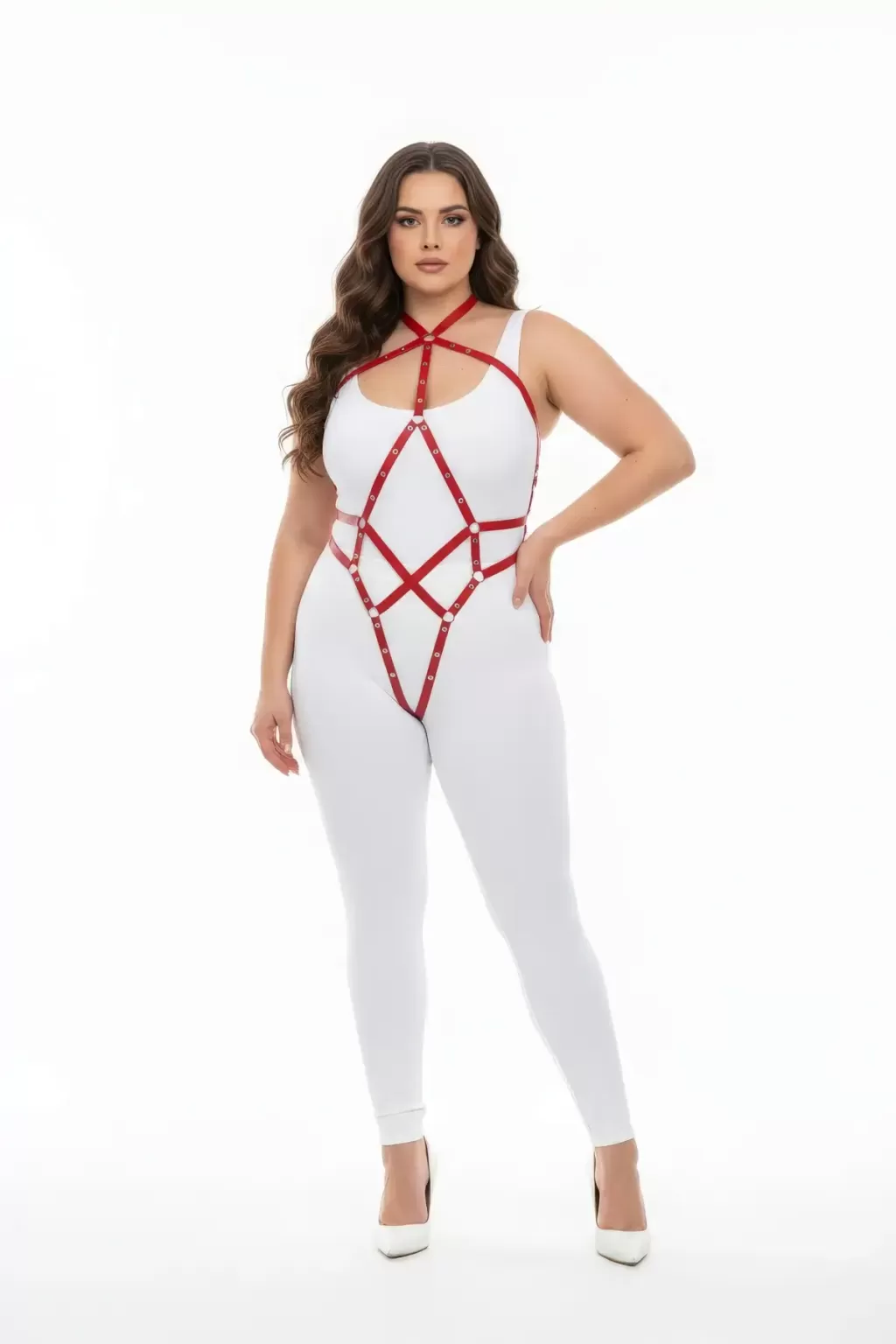 Büyük Beden Kırmızı Kadın Tam Vücut Deri Harness Fantazi Giyim - APFT295