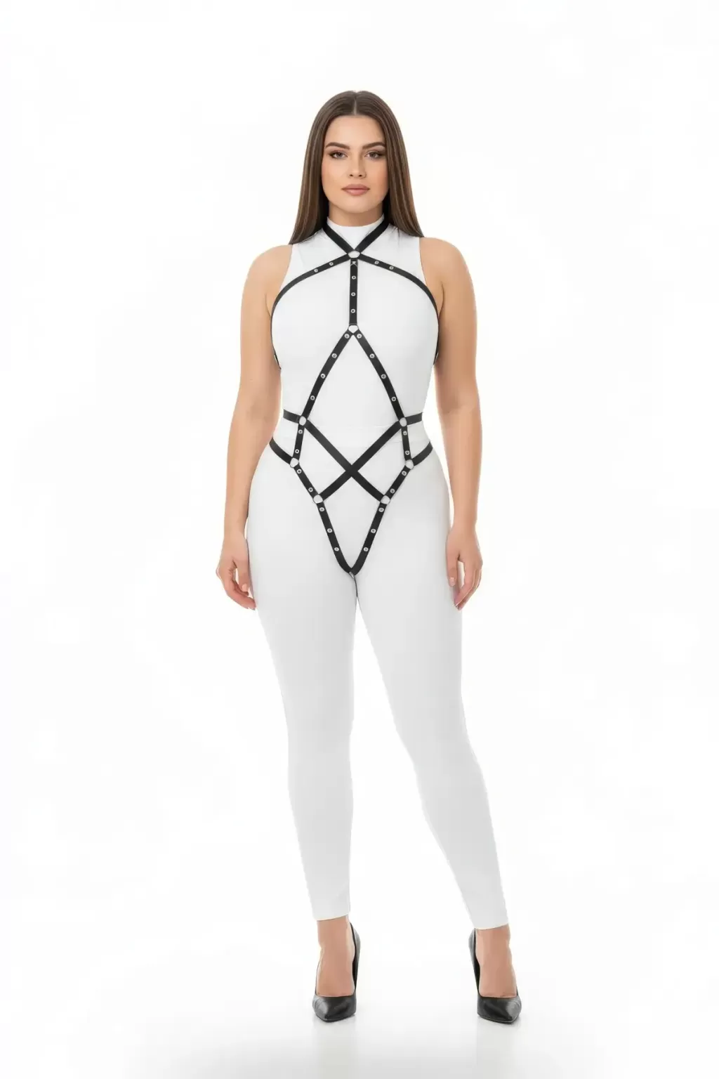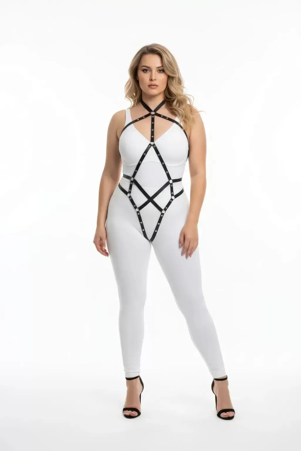 Büyük Beden Siyah Kadın Deri Harness Metal Detaylı Vücut Aksesuarı - APFT295