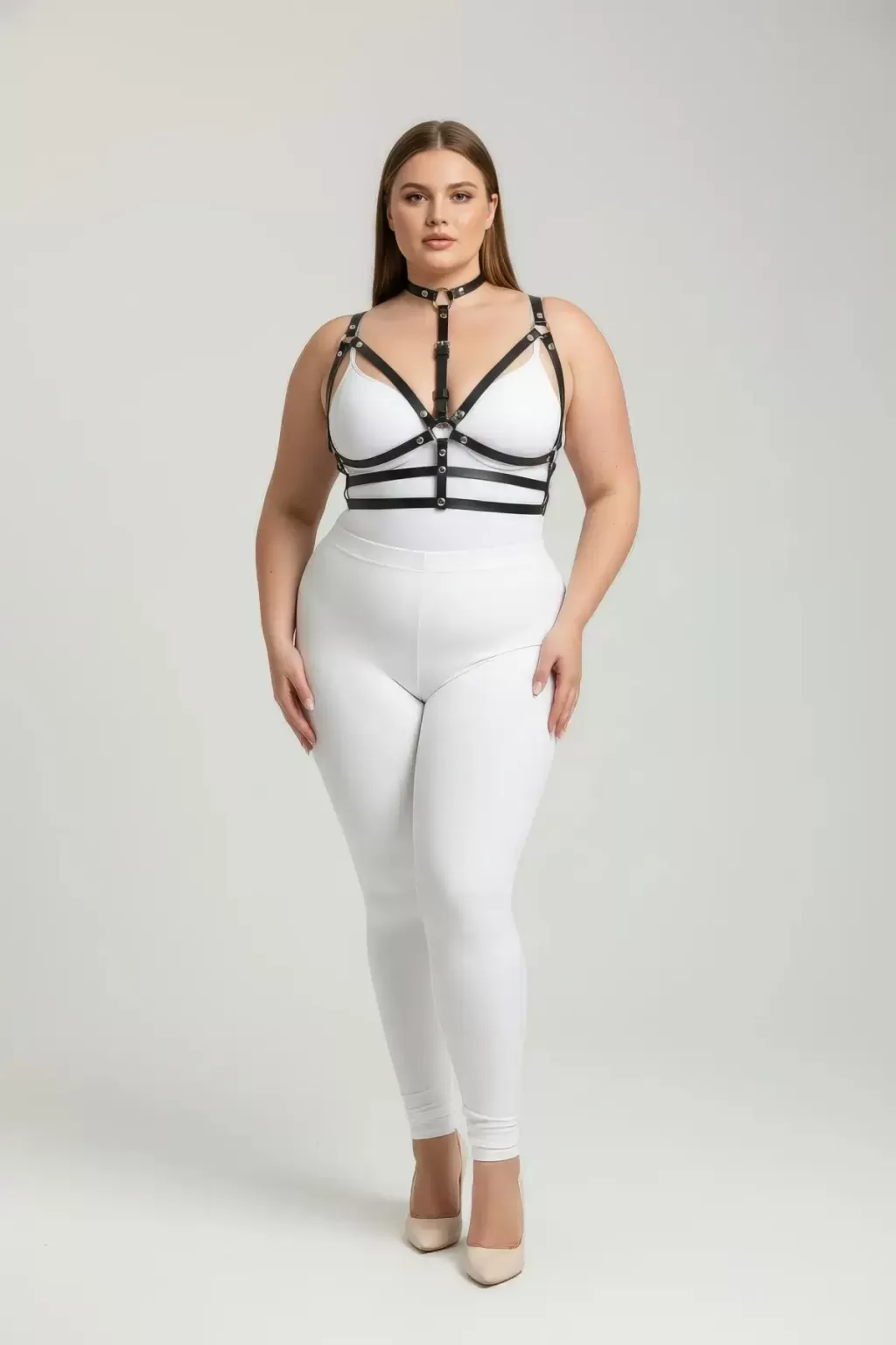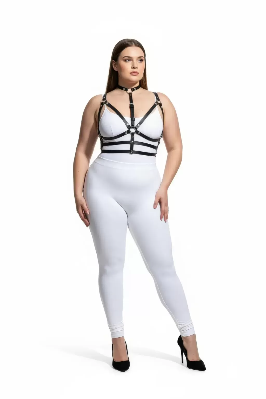 Büyük Beden Siyah Kadın Deri Harness Takım Boyunluklu Halka Detaylı - APFT235
