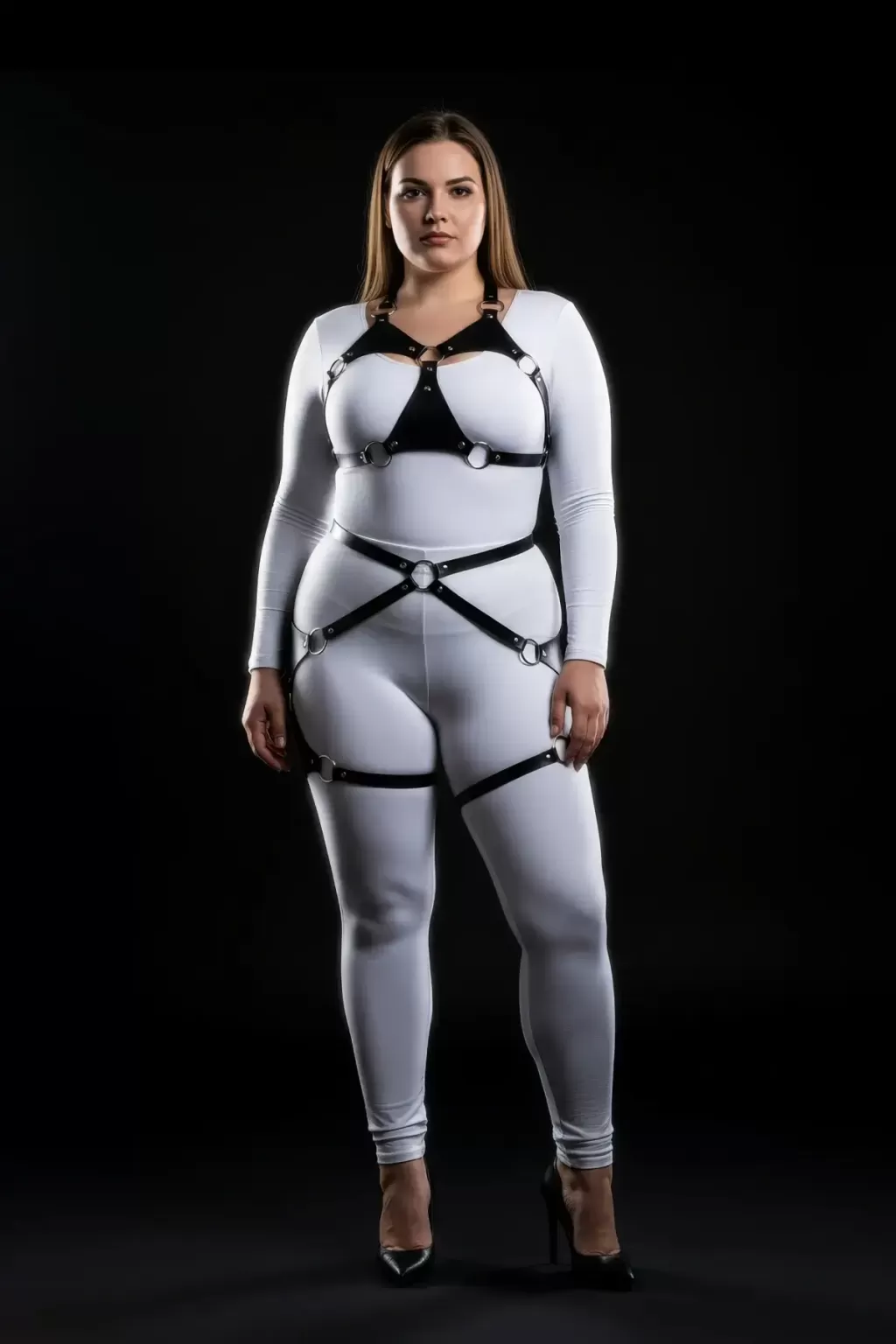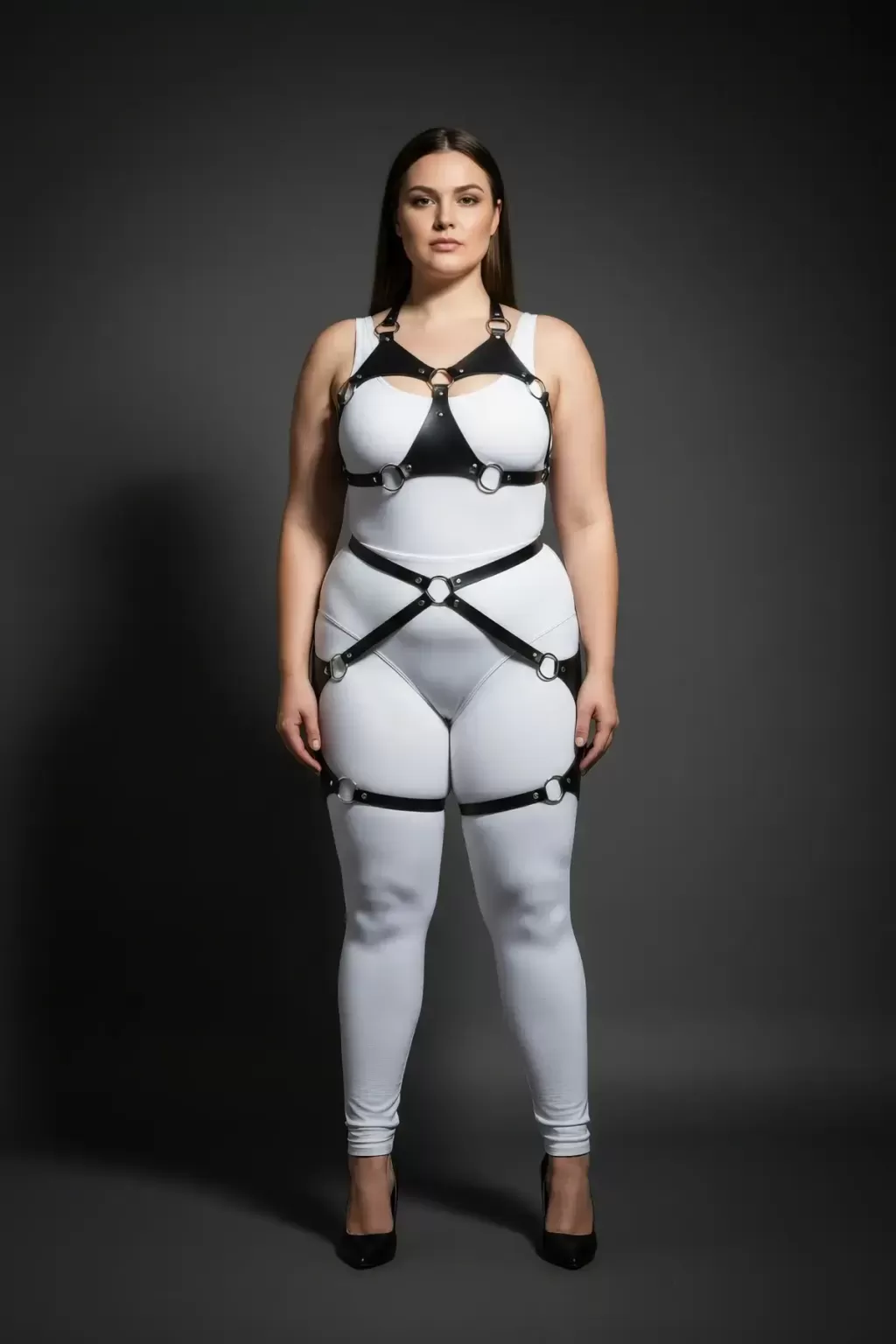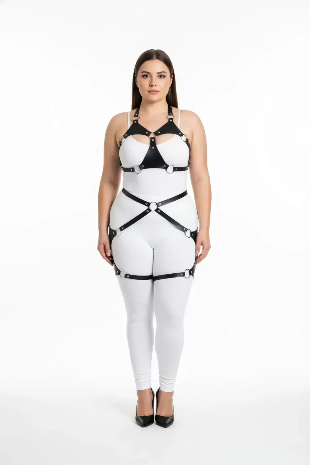 Büyük Beden Siyah Kadın Deri Harness Takım Halka Detaylı Jartiyerli - APFT1272