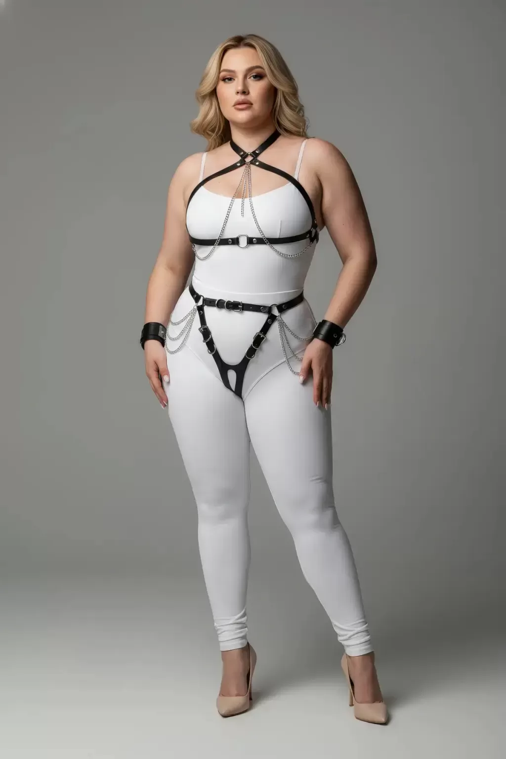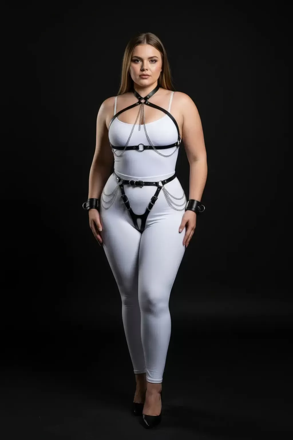 Büyük Beden Siyah Kadın Deri Harness Takım Zincir ve Jartiyer Detaylı - APFT1224