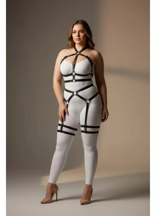 Büyük Beden Siyah Kadın Jartiyer Harness Boyun ve Bacak Detaylı Deri Aksesuar - APFT230