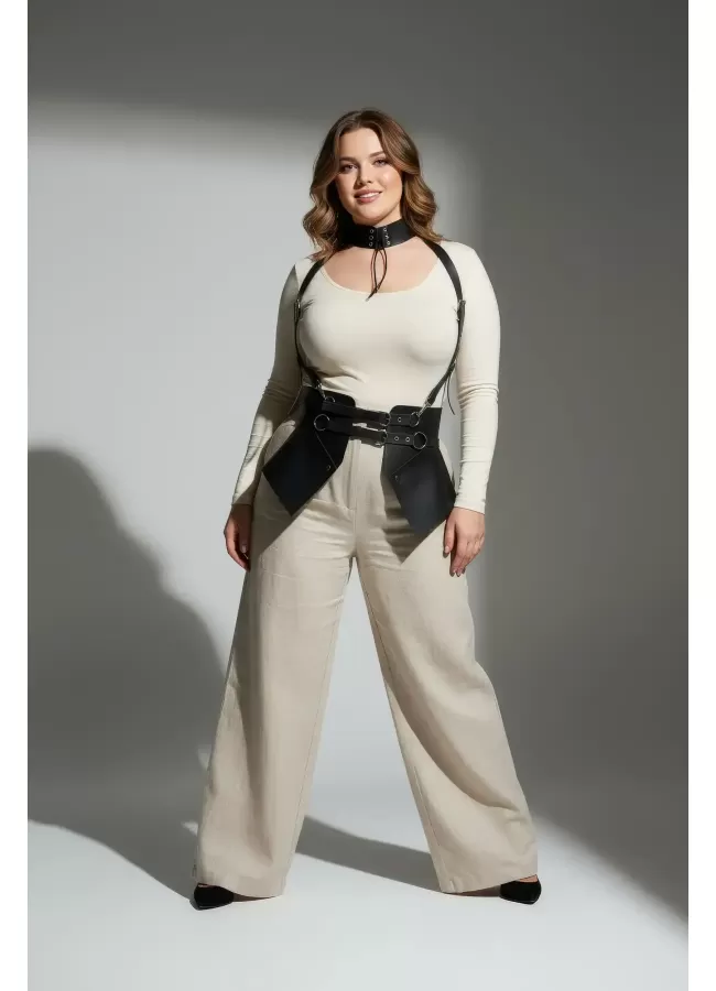 Büyük Beden Siyah Kadın Deri Kemer Omuz Askılı Bağcıklı Korse - APFT1429