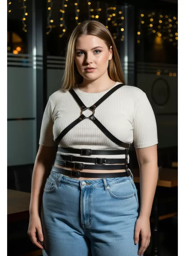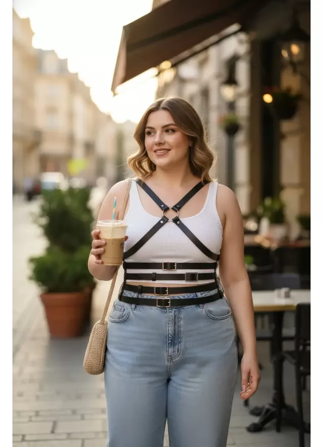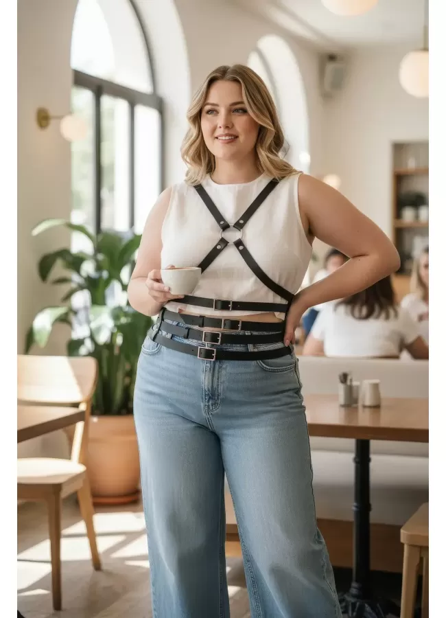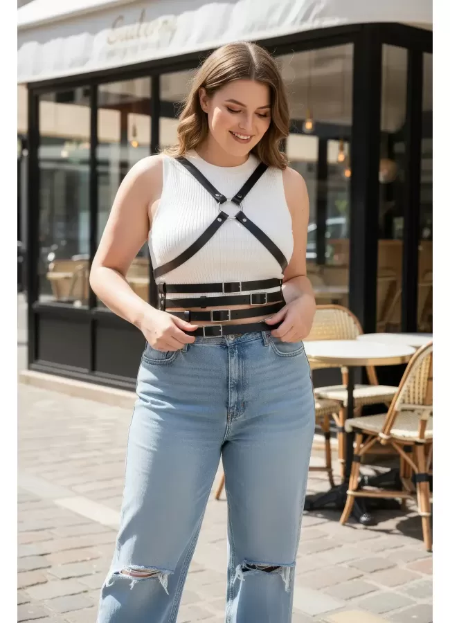 Siyah Kadın Kemer Omuz Detaylı Çift Tokalı Vücut Aksesuarı - APFT1113