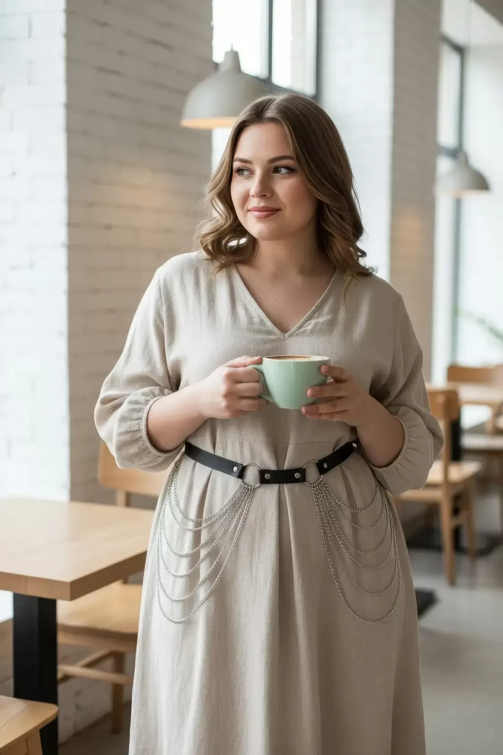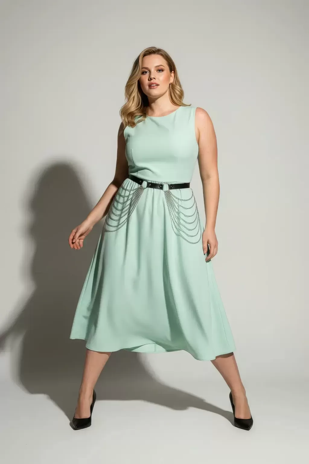 Büyük Beden Siyah Kadın Deri Kemer Zincir Detaylı Elbise Üstü - APFT391