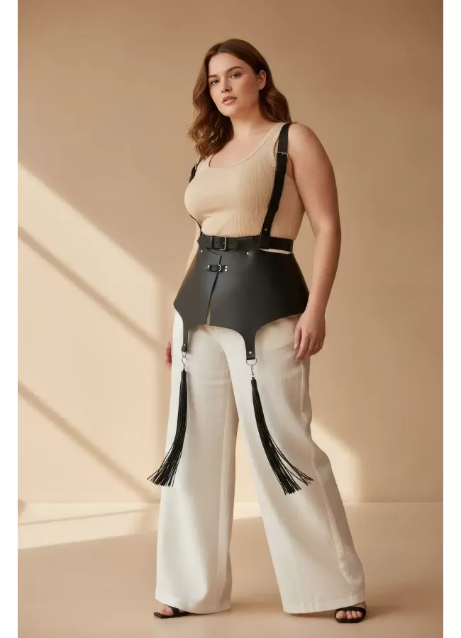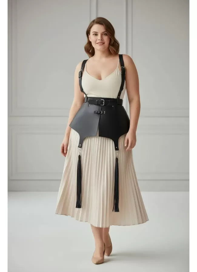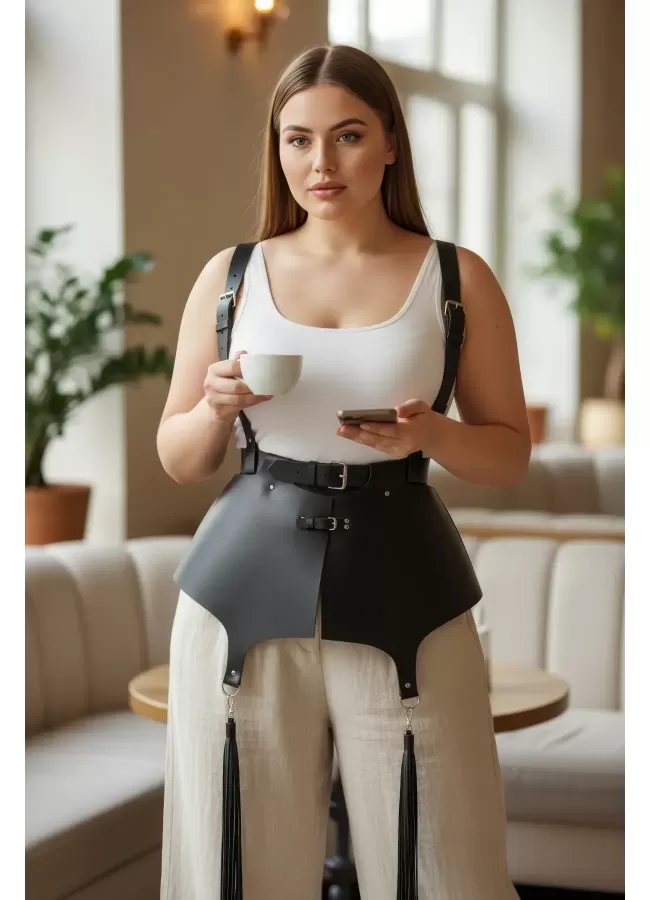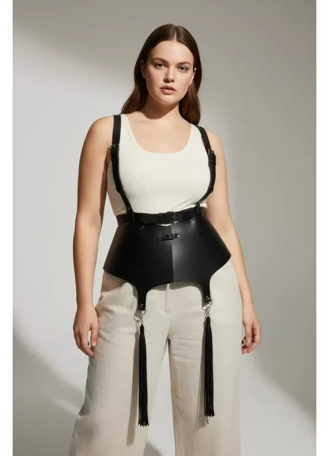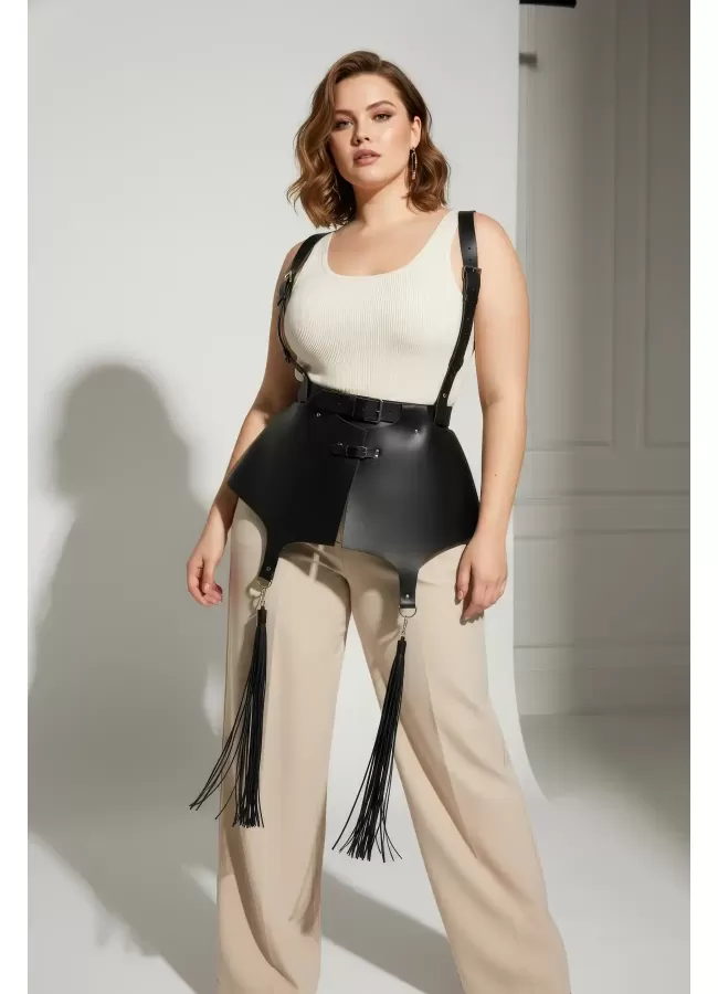 Büyük Beden Siyah Kadın Deri Korse Kemer, Omuz Askılı ve Püskül Detaylı - APFT787
