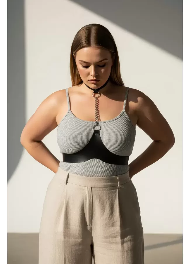 Büyük Beden Siyah Kadın Deri Kemer Omuz Askılı Bağcıklı Korse - APFT1429