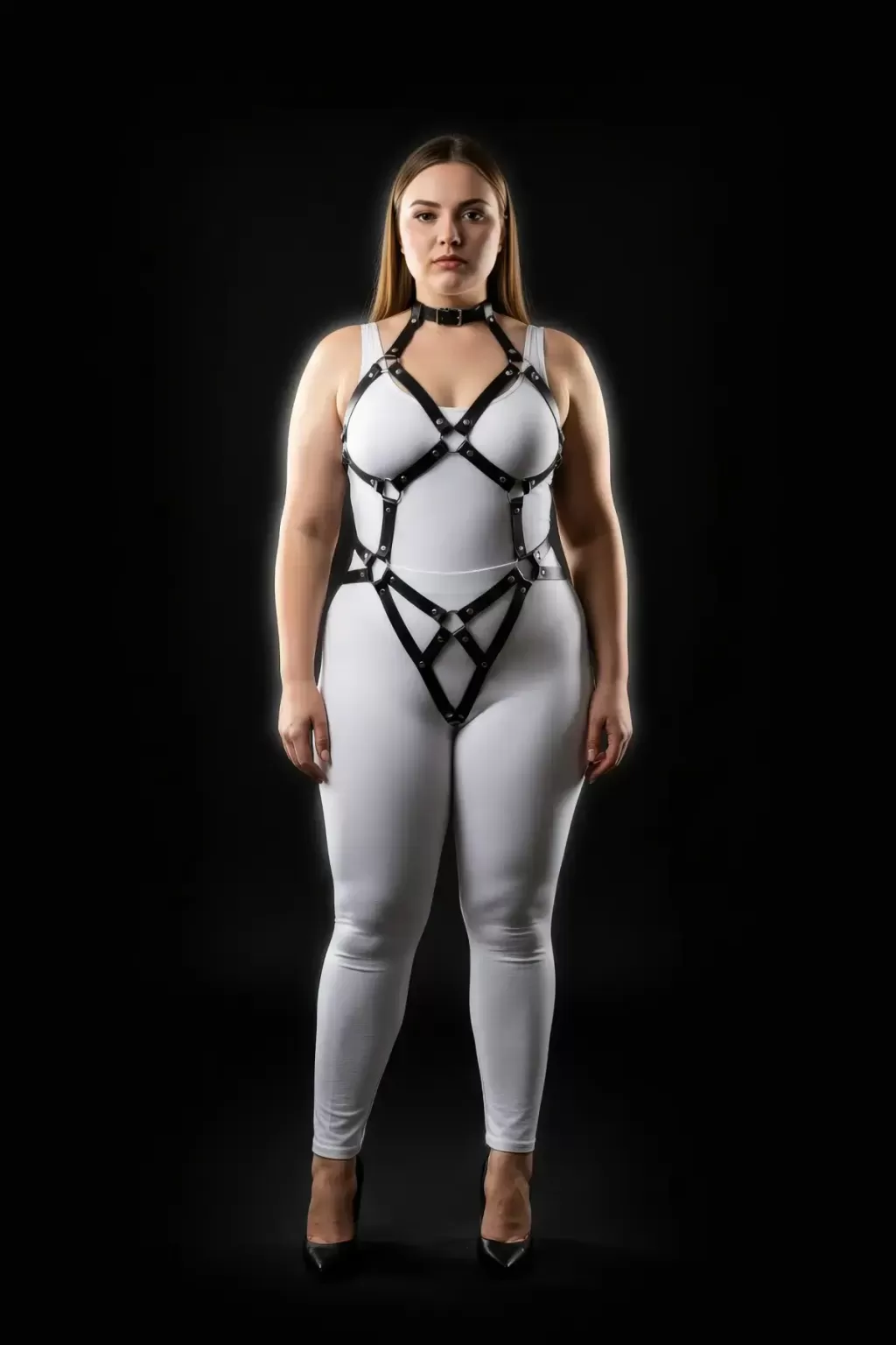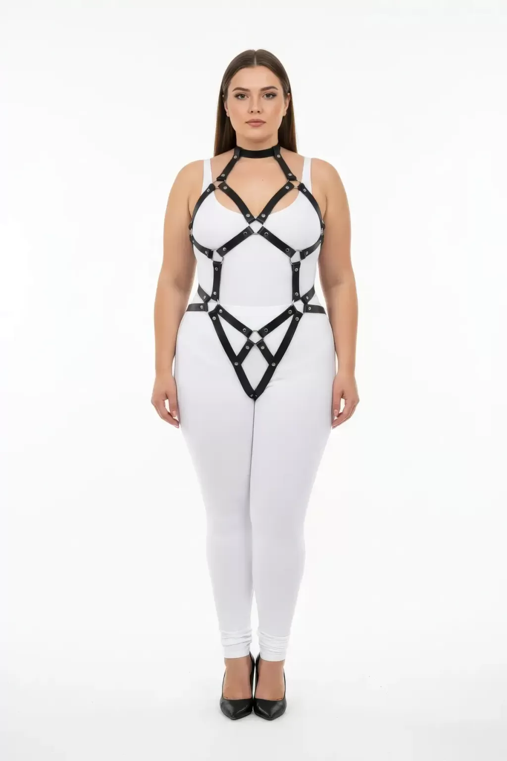 Büyük Beden Siyah Kadın Harness Takım Deri Halka Detaylı Fantazi Vücut Aksesuarı - APFT514