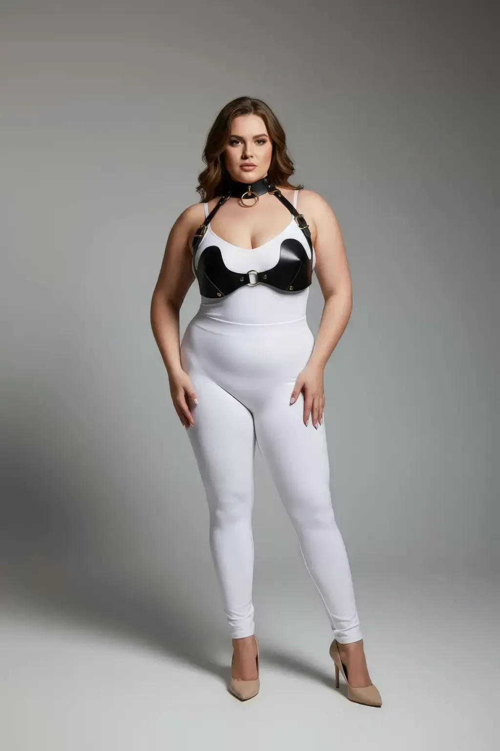 Büyük Beden Siyah Kadın Harness Takım Göğüs ve Choker Detaylı Seksi Deri - APFT1226