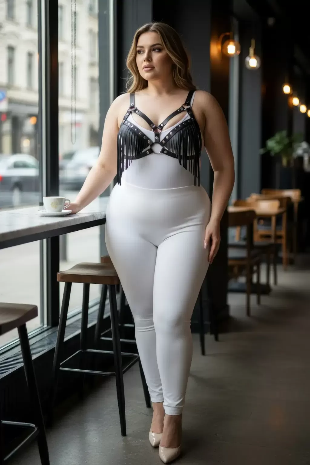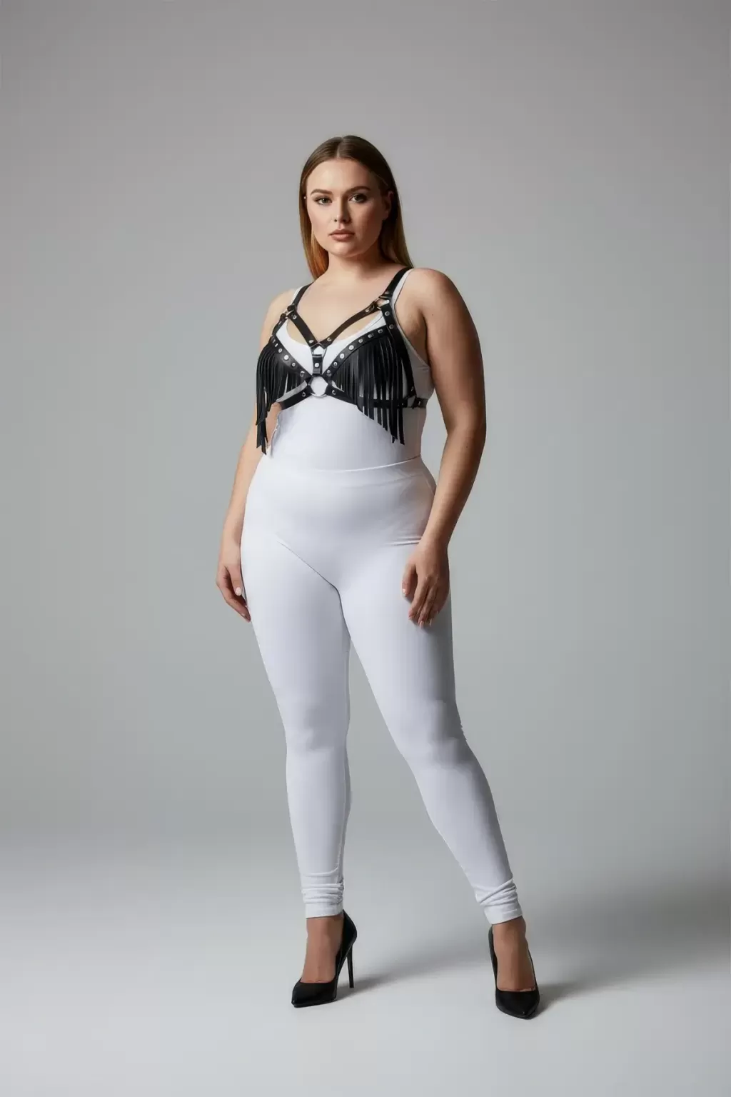 Büyük Beden Siyah Kadın Harness Takım Püskül Detaylı Deri Sütyen Aksesuarı - APFT418