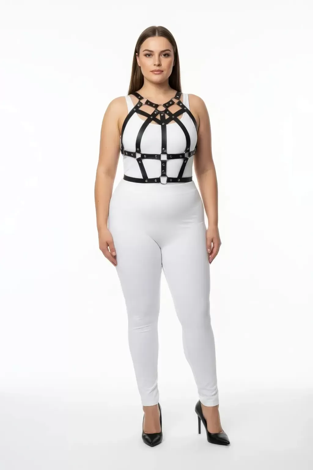 Büyük Beden Siyah Kadın Harness Takım Zımba Detaylı Şık Vücut Aksesuarı - APFT1085